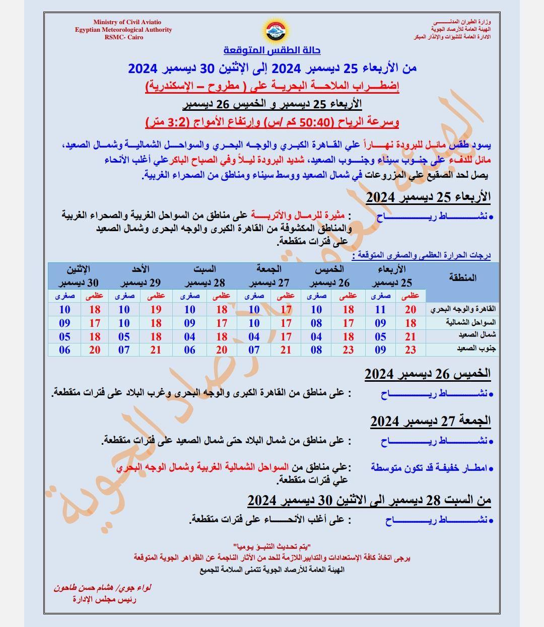 كما تنشط الرياح الجنوبية الغربية ليومي الأربعاء 25 ديسمبر والخميس 26 ديسمبر 2024 على مناطق من الصحراء الغربية ومناطق من (مطروح - الإسكندرية)
