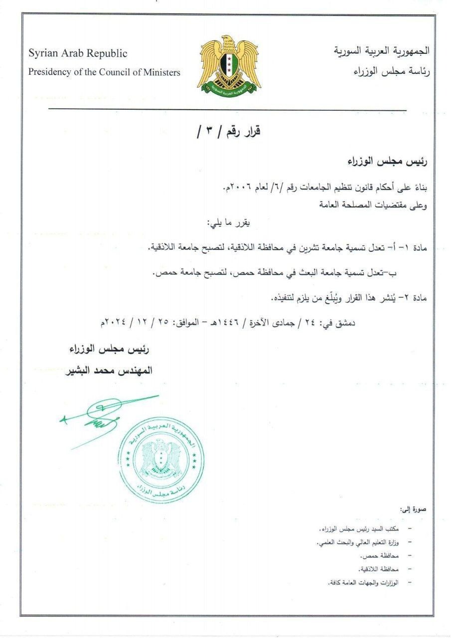 ووفق القرار الصادر عن رئيس حكومة تصريف الأعمال، محمد البشير، تقرر تعديل تسمية جامعة تشرين في محافظة اللاذقية لتصبح " جامعة اللاذقية "، وتسمية جامعة البعث في محافظة حمص لتصبح "جامعة حمص"، بحسب ما نقلت الوكالة السورية للأنباء "سانا".