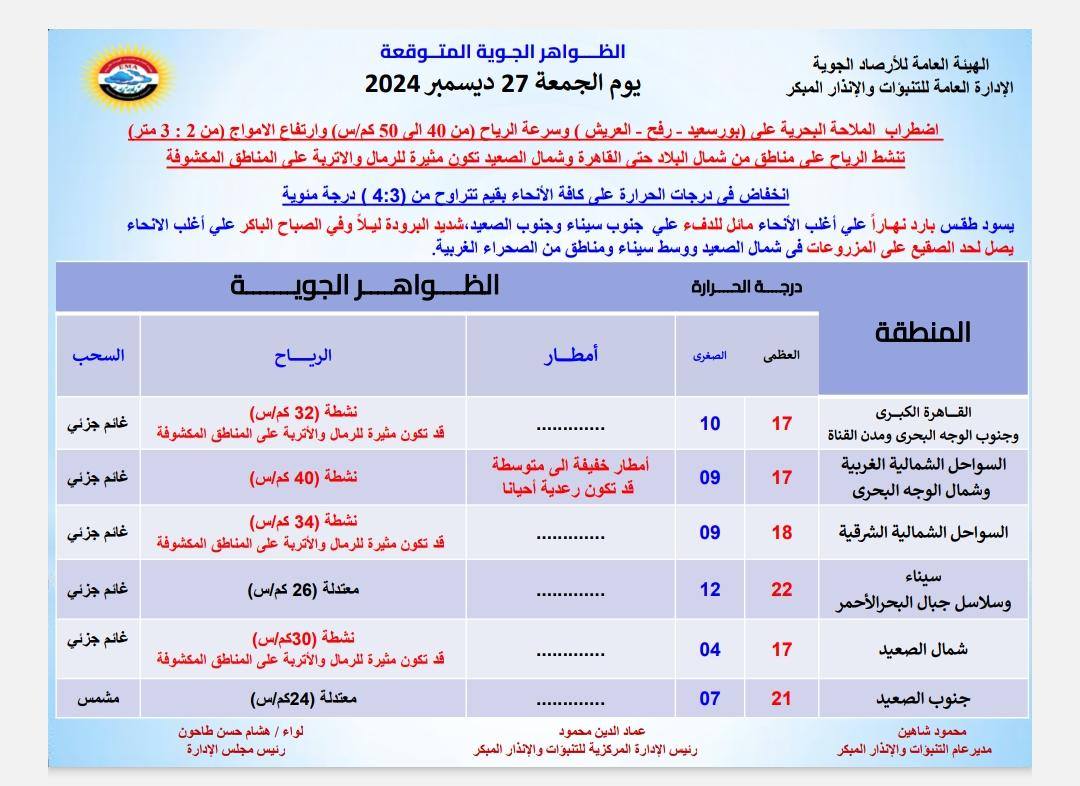 كما توقعت هيئة الارصاد الجوية أن يسود طقس شديد البرودة ليلا وفى الصباح الباكر على أغلب الأنحاء و على جنوب الصعيد وشديد البرودة على وسط سيناء وشمال الصعيد.