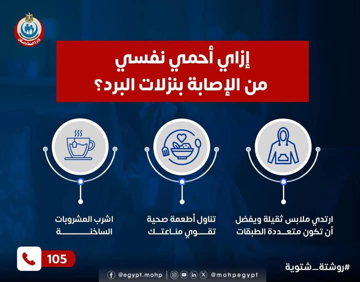 تزامنا مع زيادة الإصابات بنزلات البرد والفيروسات التنفسية في موسم الشتاء، وجهت وزارة الصحة نصائح للحماية من الإصابة بنزلات البرد.