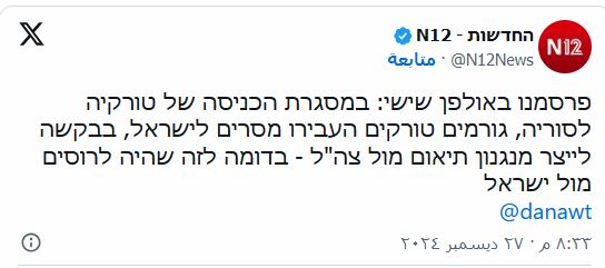 قالت "القناة 12" العبرية، الجمعة، إن مسؤولين أتراكًا بعثوا برسائل إلى تل أبيب يطلبون فيها إنشاء آلية تنسيق مع الجيش الإسرائيلي على غرار الآلية التي كانت بين روسيا وإسرائيل في سوريا.