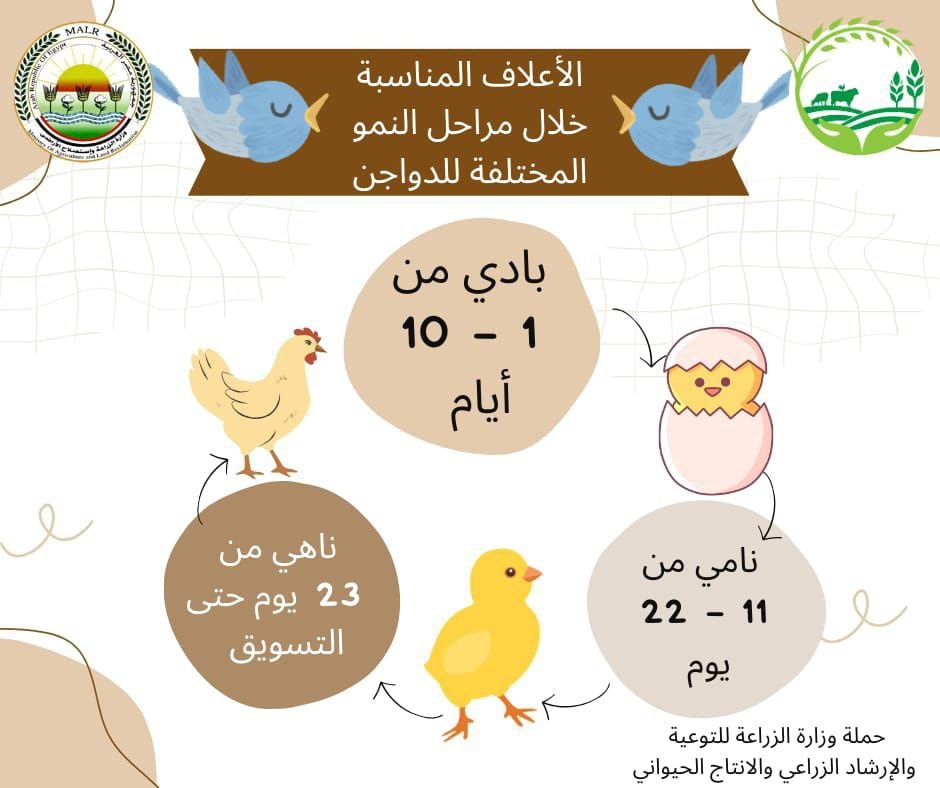 نشرت الصفحة الرسمية لوزارة الزراعة تقرير مصور عن الأعلاف المناسبة لتربية الدواجن تحت عنوان تعرف على الأعلاف المناسبة خلال مراحل النمو المختلفة للدواجن.