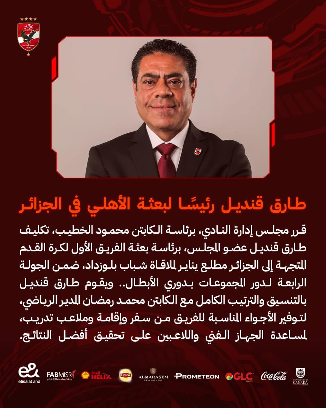 قرر مجلس إدارة النادي الأهلي، برئاسة محمود الخطيب، تكليف طارق قنديل عضو المجلس، برئاسة بعثة الفريق الأول لكرة القدم بالنادي المتجهة إلى الجزائر مطلع يناير لملاقاة شباب بلوزداد، ضمن الجولة الرابعة لدور المجموعات بدوري أبطال إفريقيا.