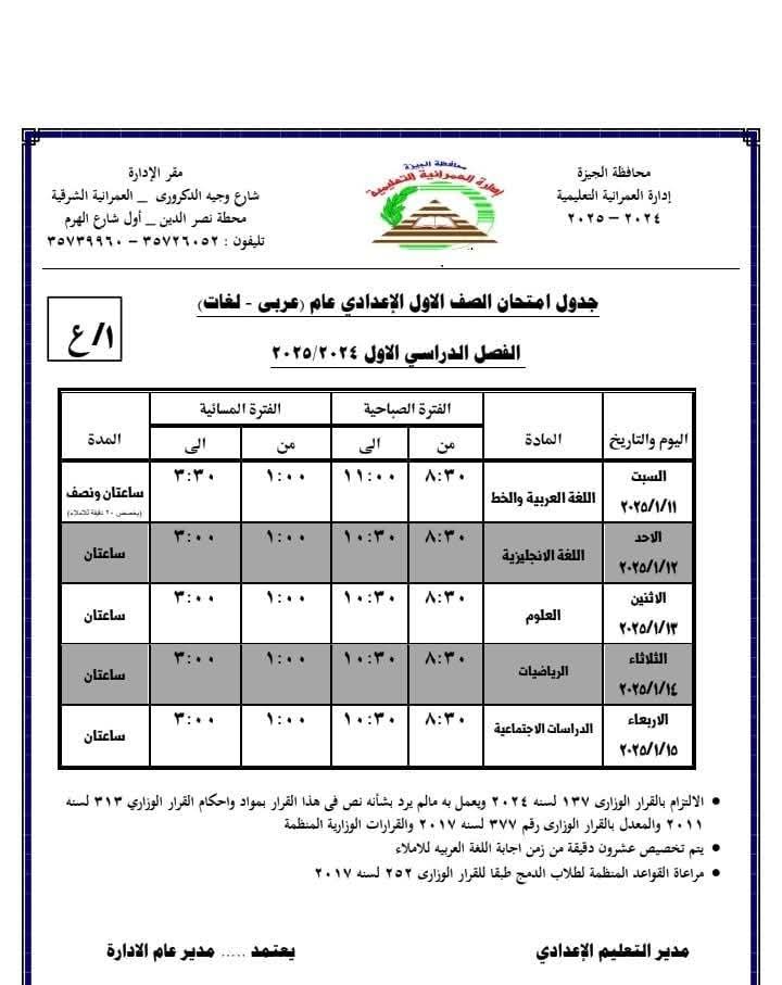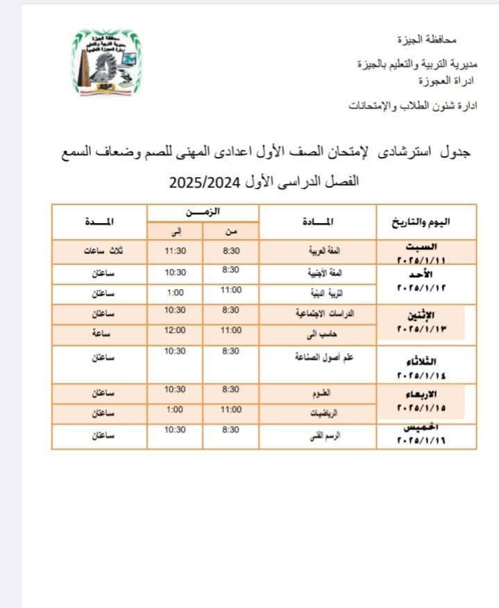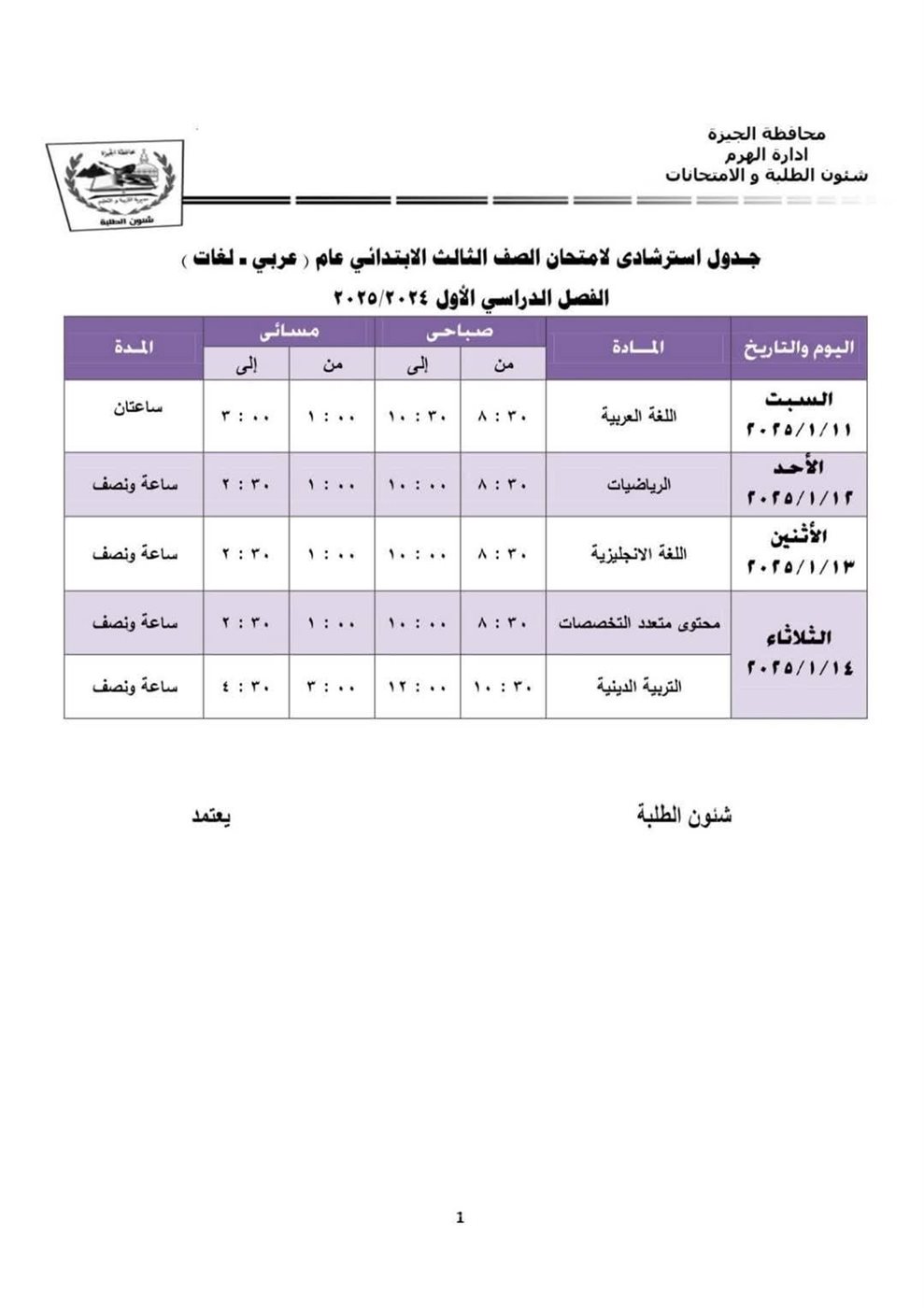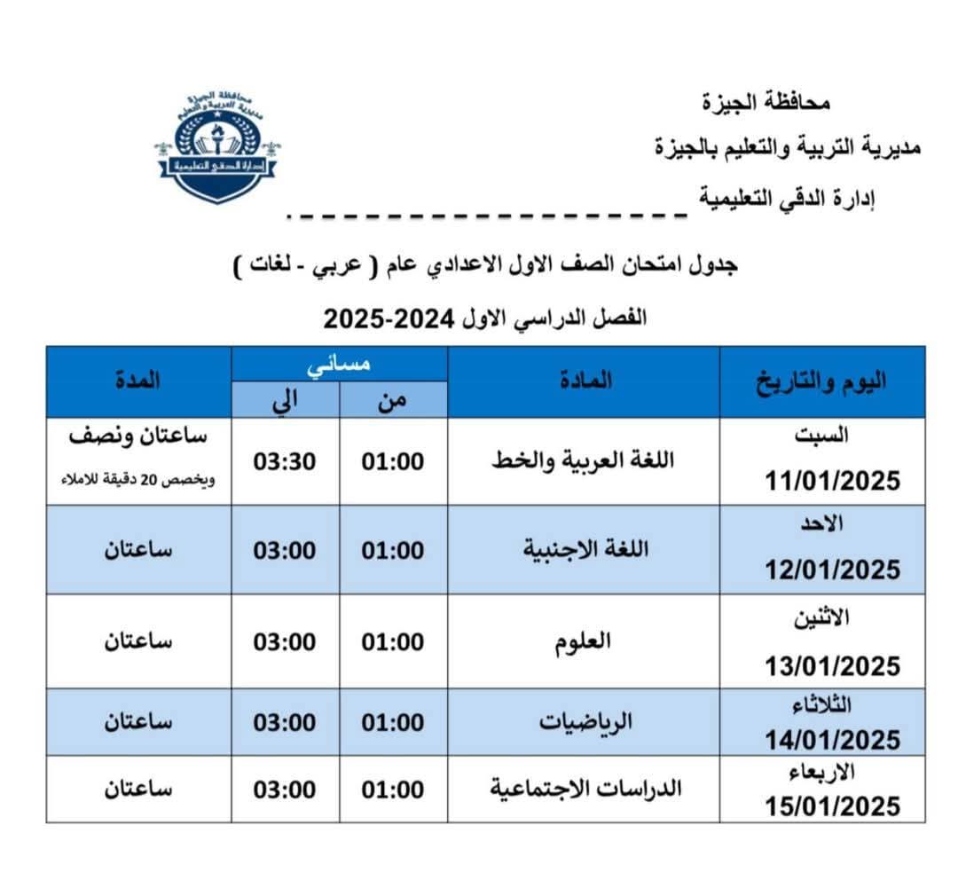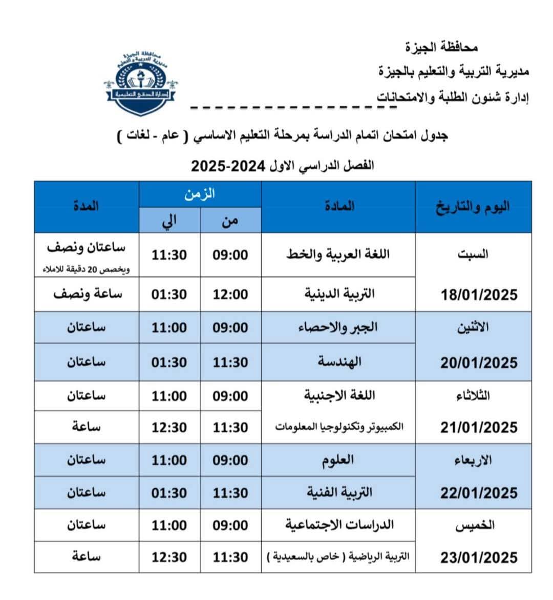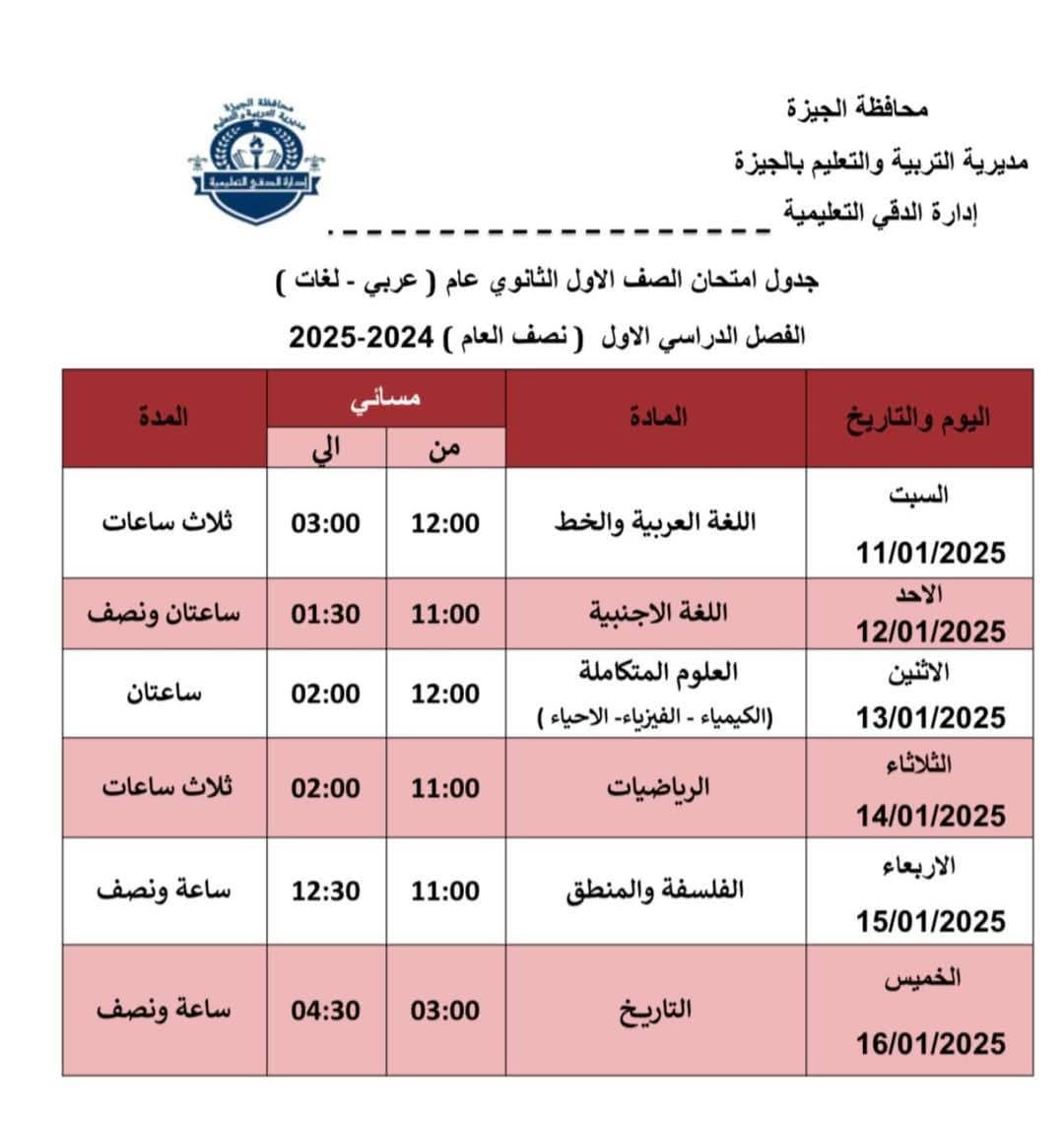 جداول امتحانات الفصل الدراسي الأول لطلاب الهرم والعمرانية والدقي والعجوزة