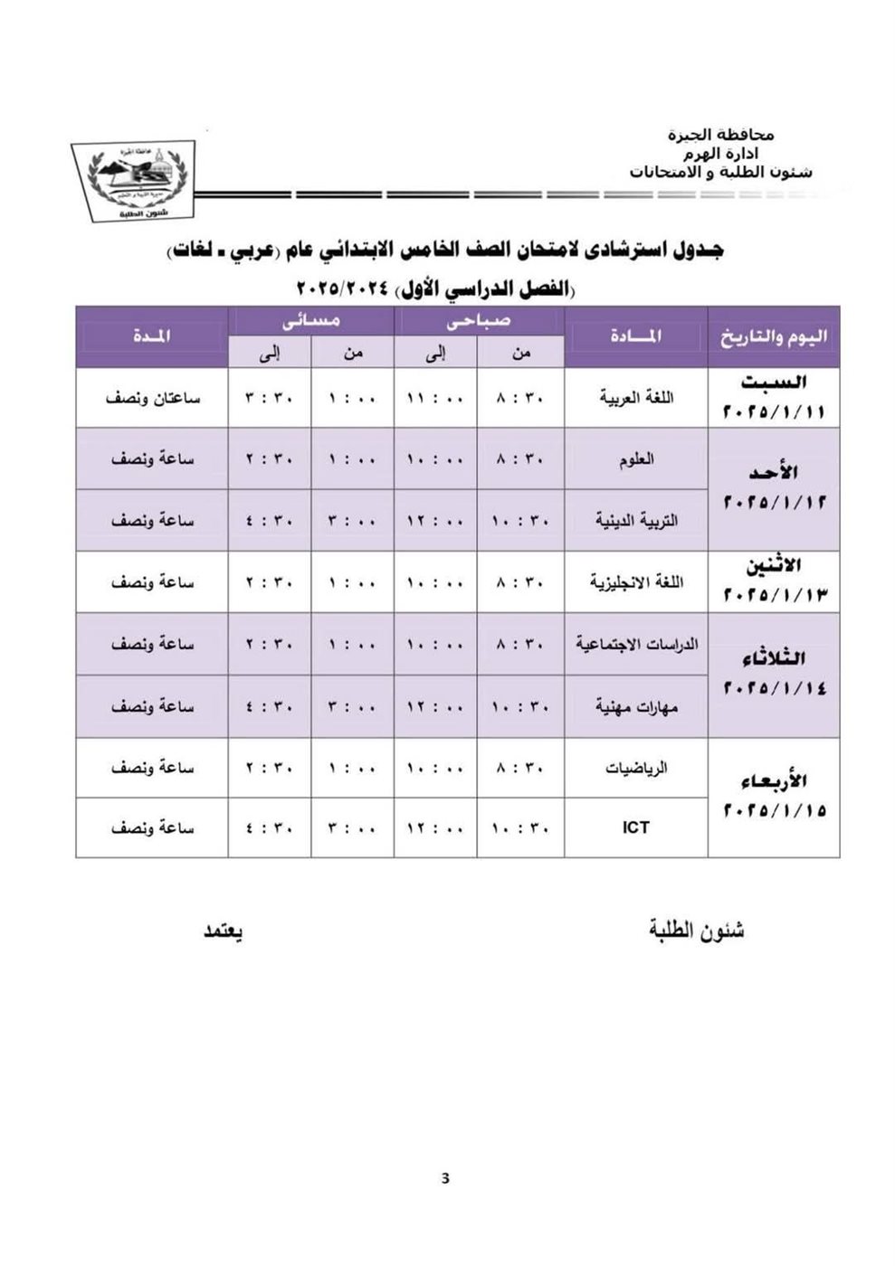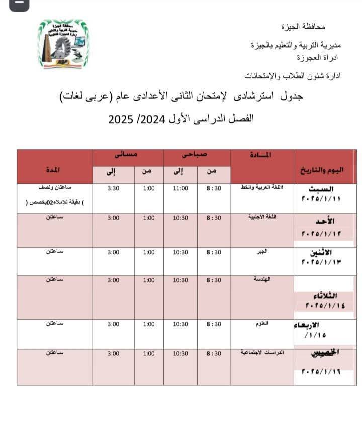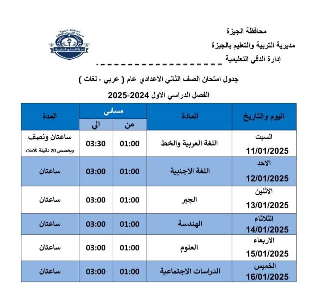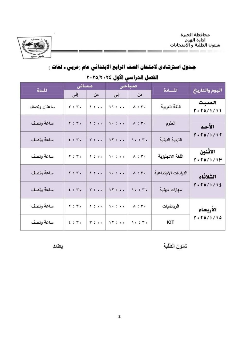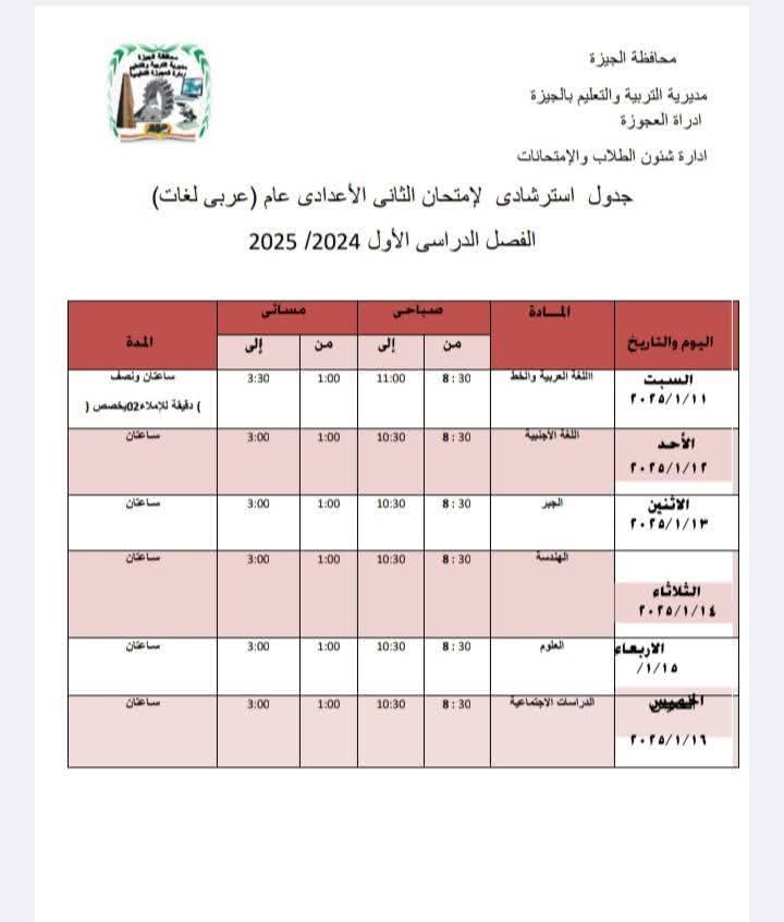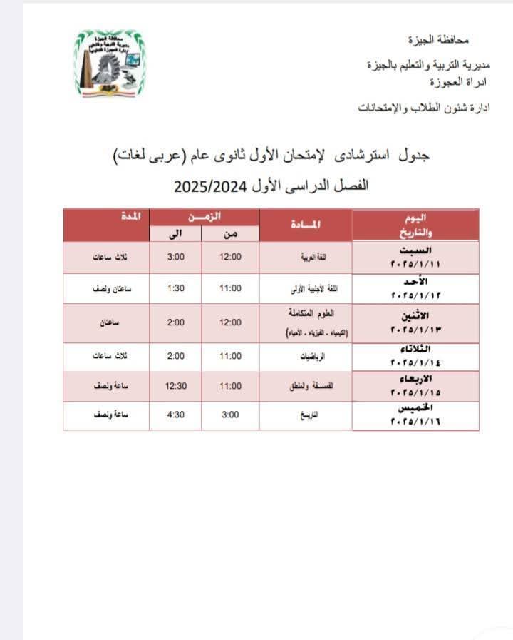 جداول امتحانات الفصل الدراسي الأول لطلاب الهرم والعمرانية والدقي والعجوزة