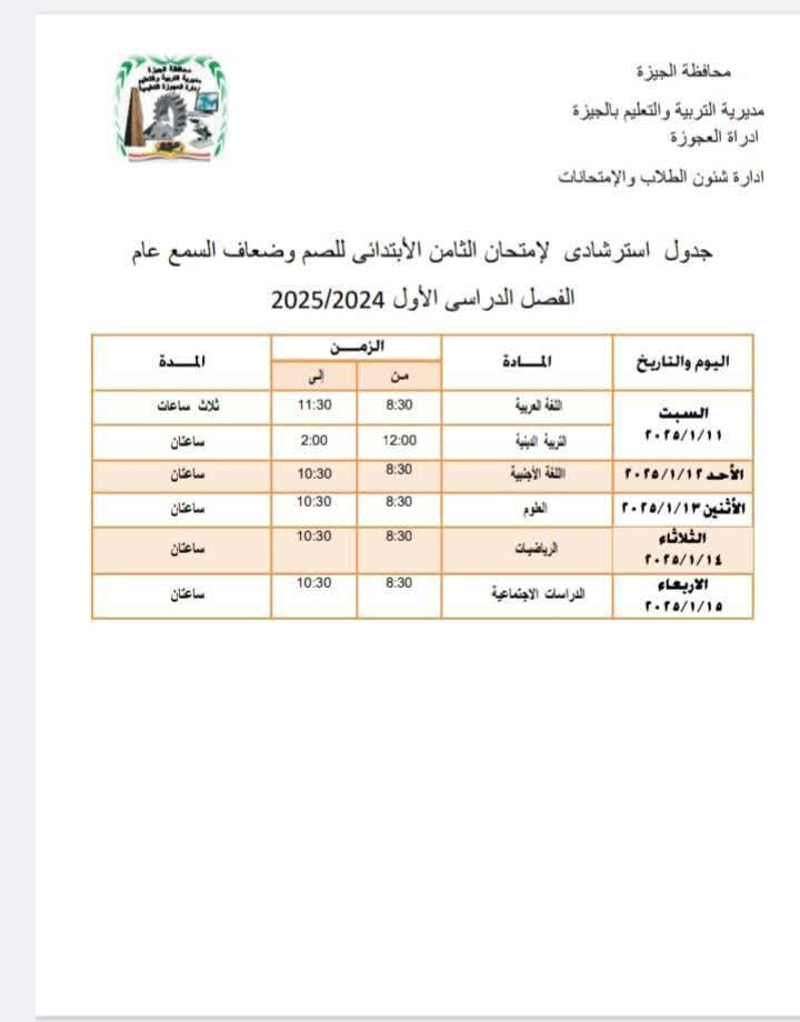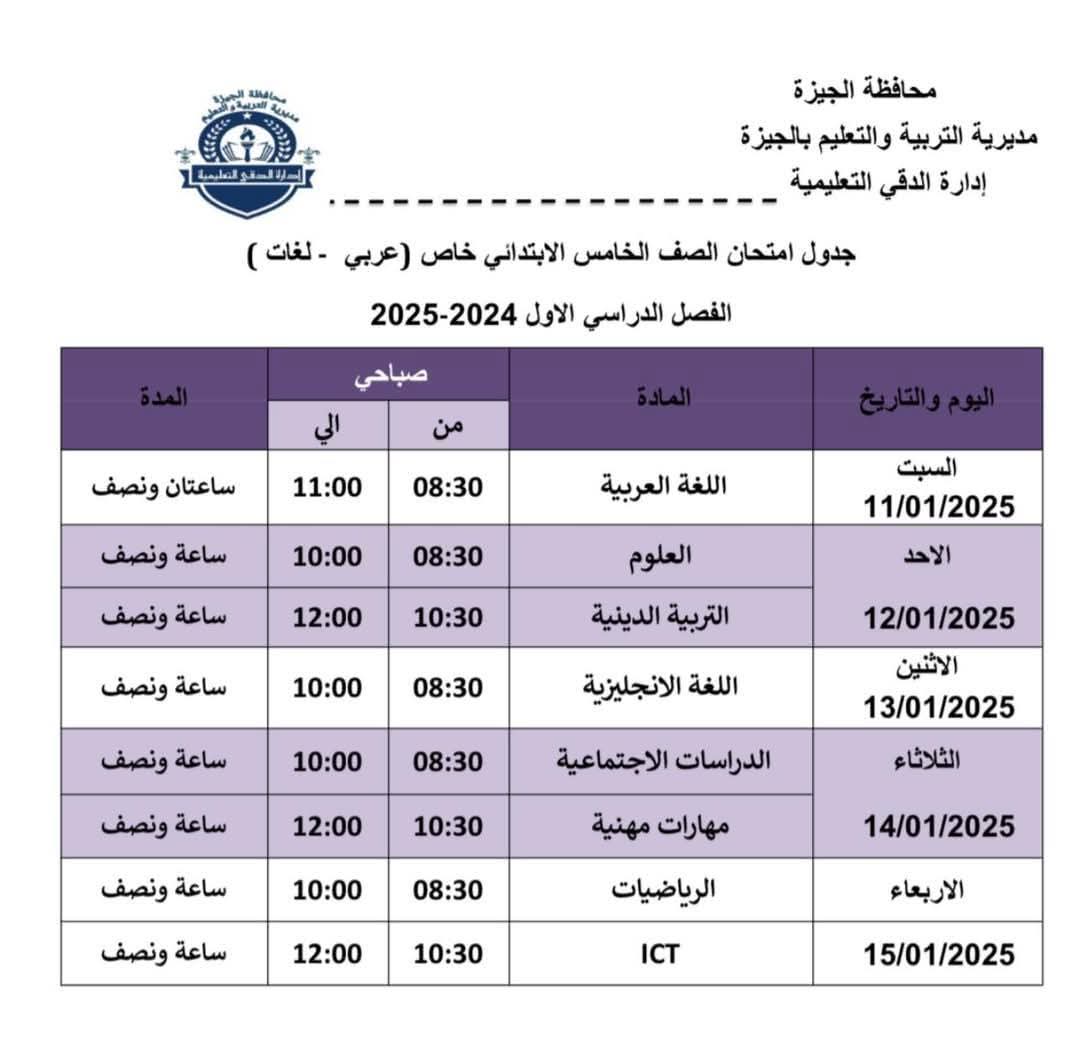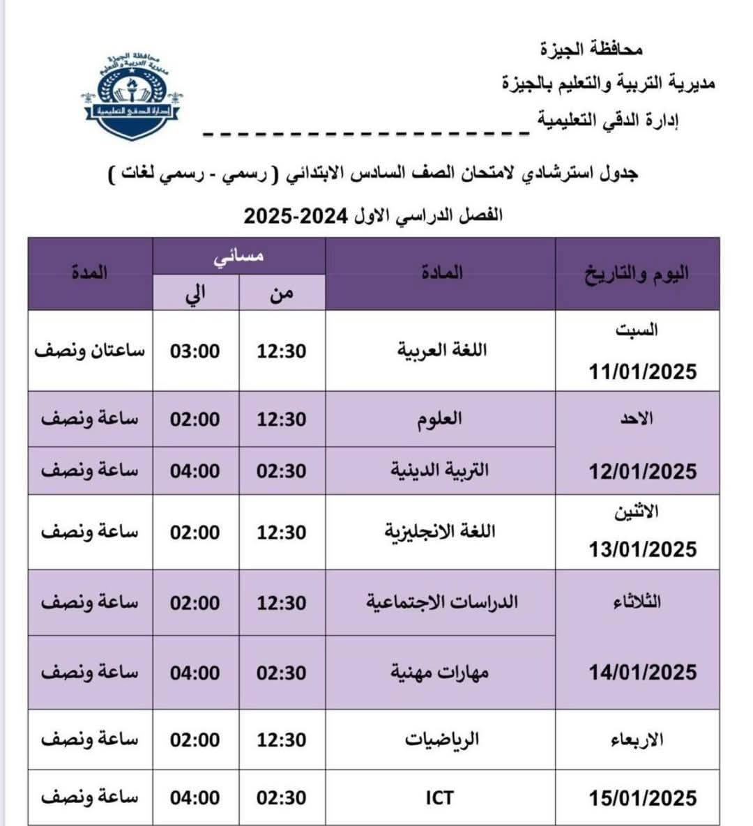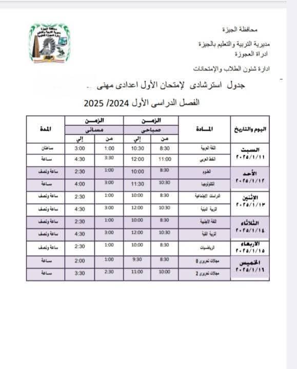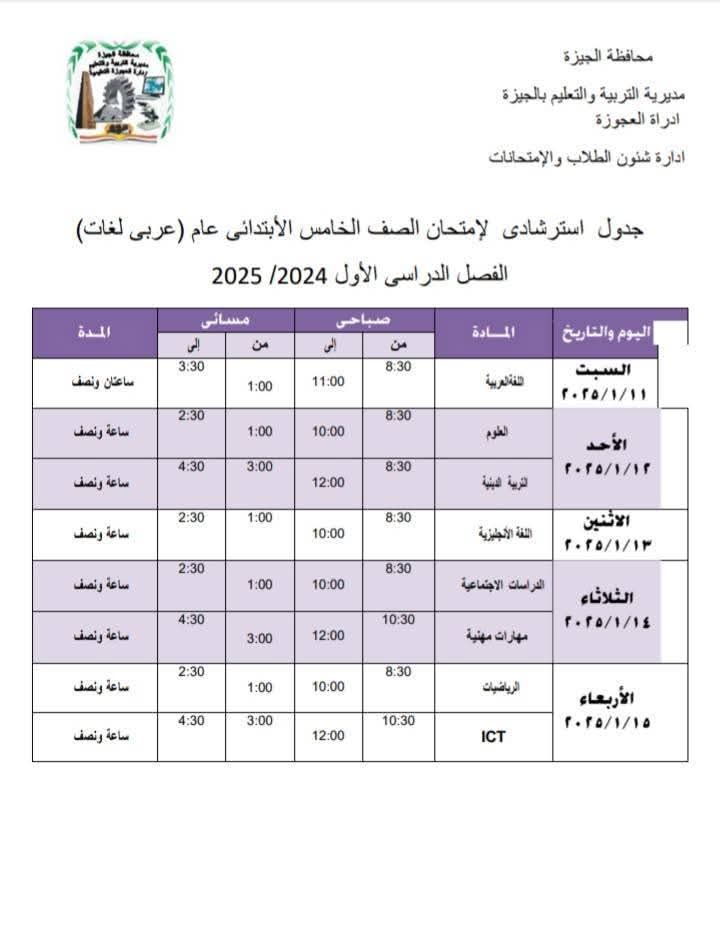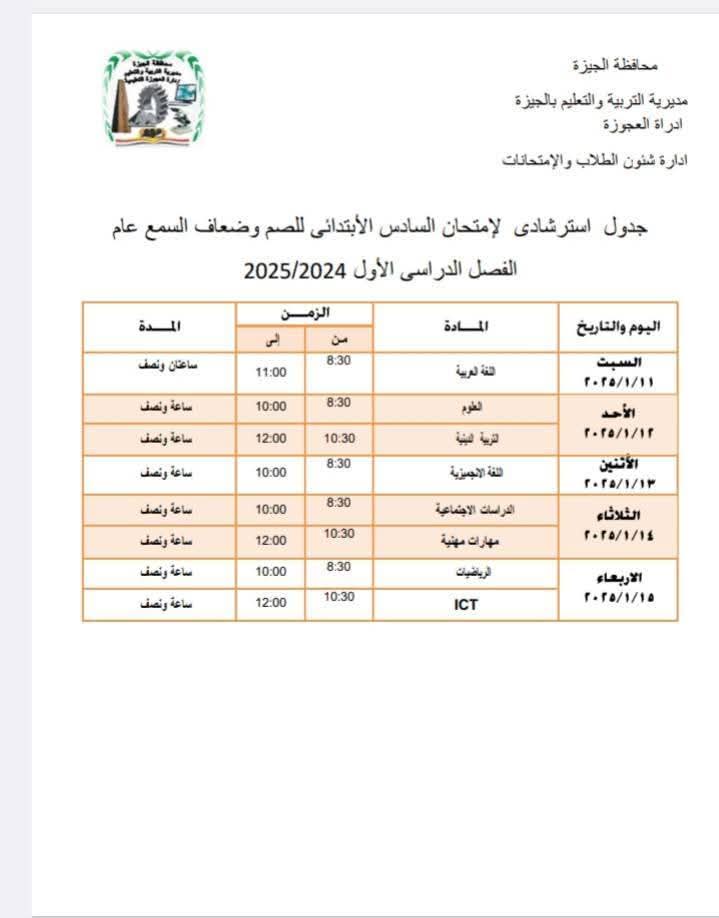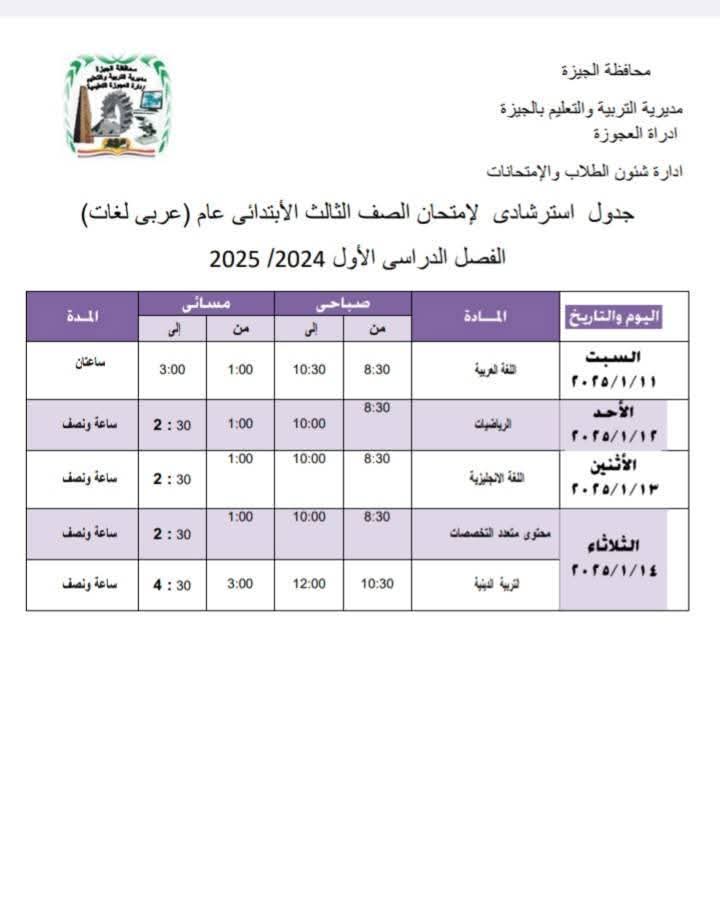 جداول امتحانات الفصل الدراسي الأول لطلاب الهرم والعمرانية والدقي والعجوزة