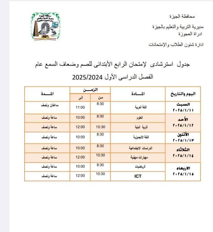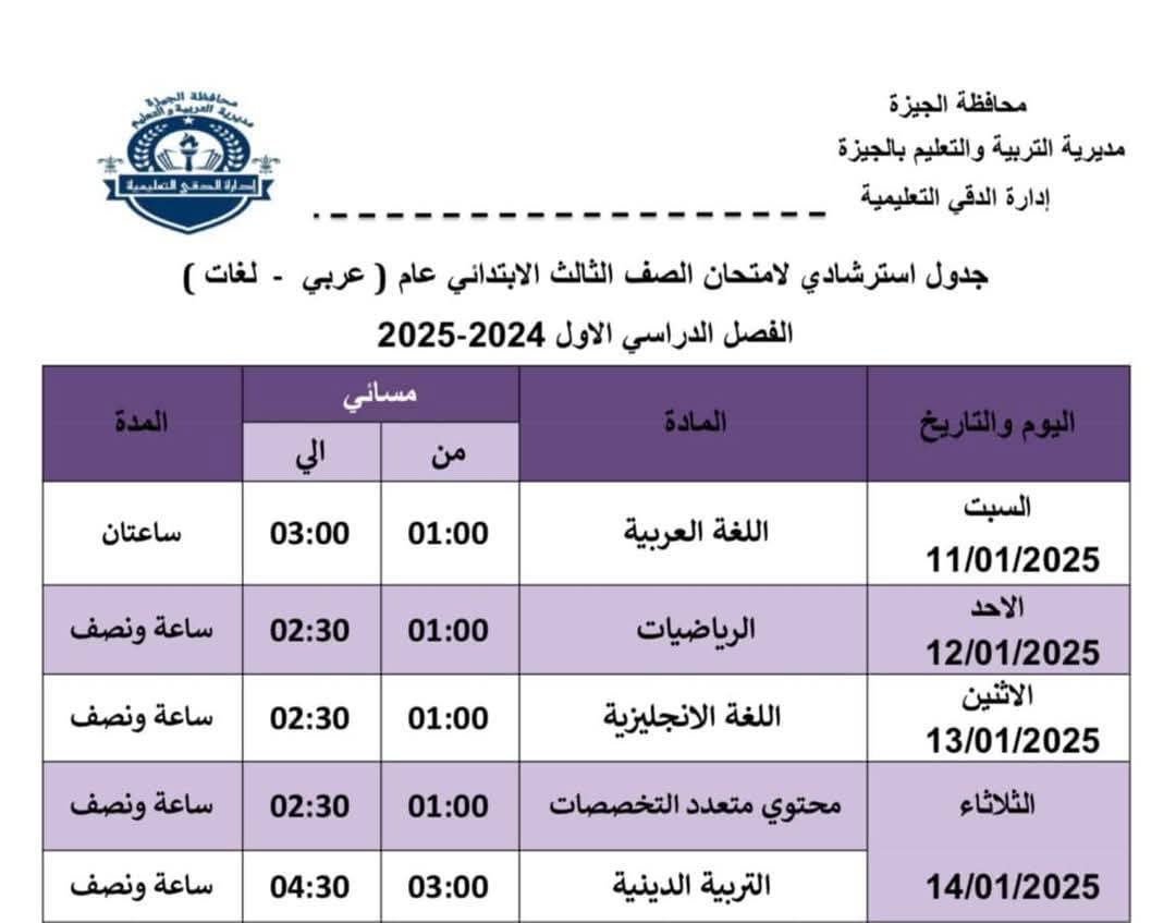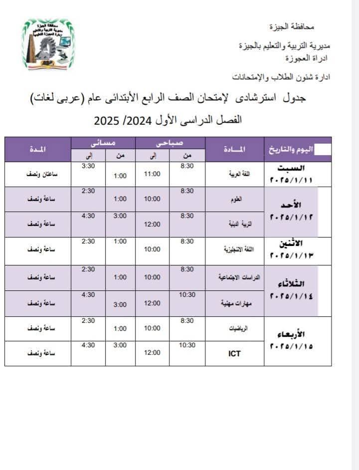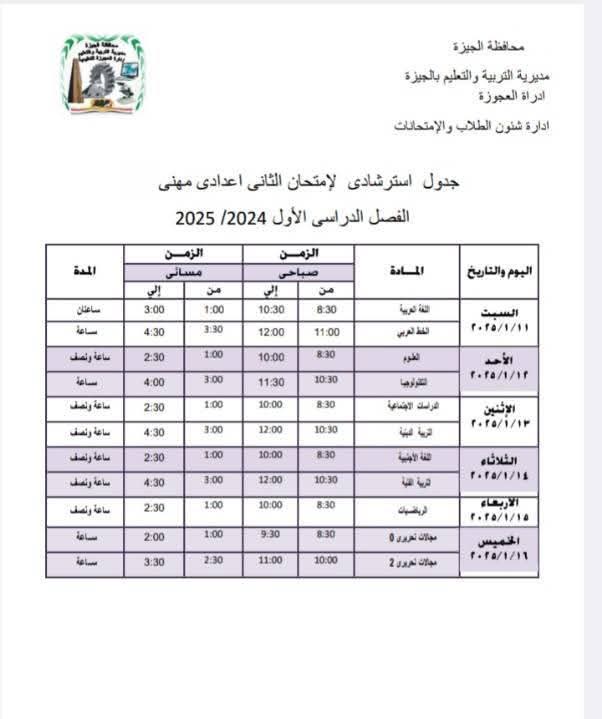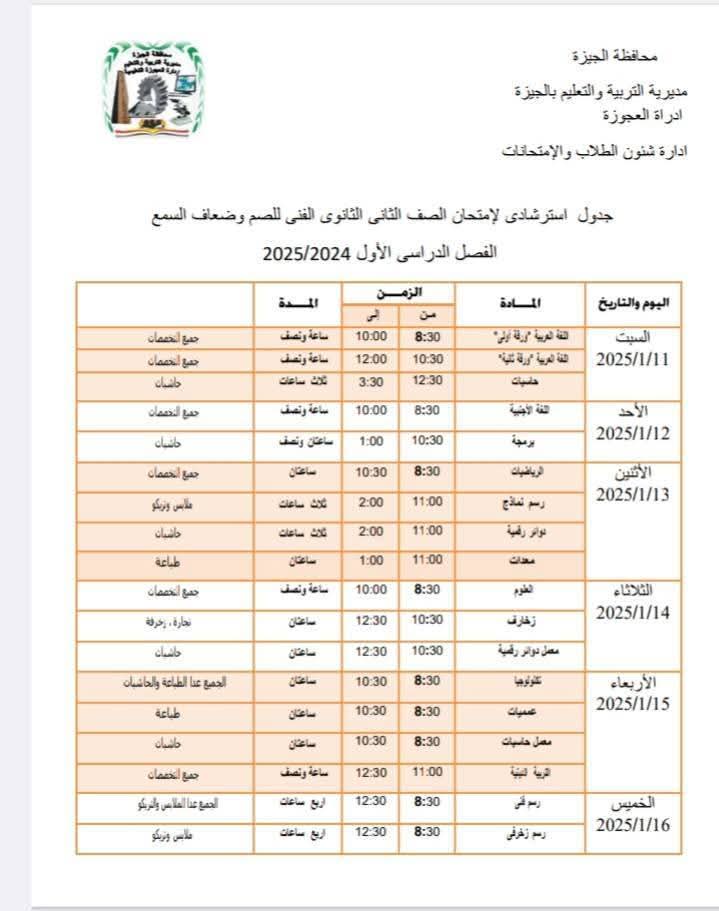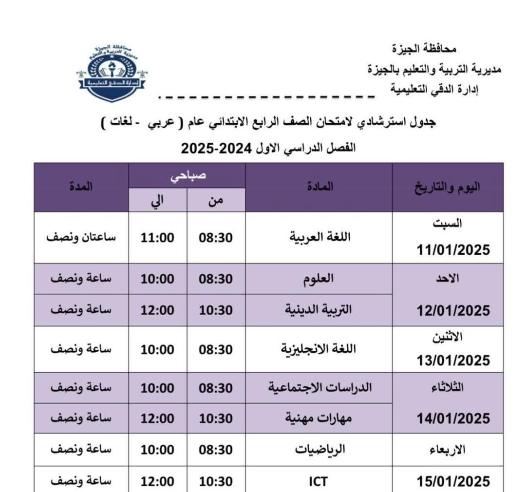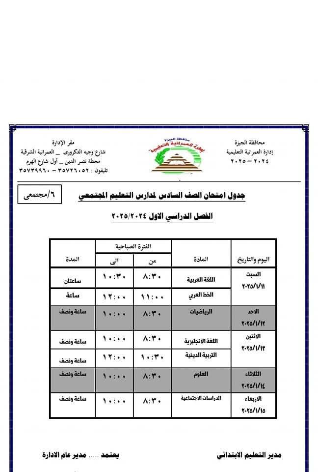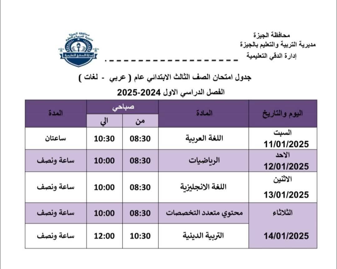 جداول امتحانات الفصل الدراسي الأول لطلاب الهرم والعمرانية والدقي والعجوزة