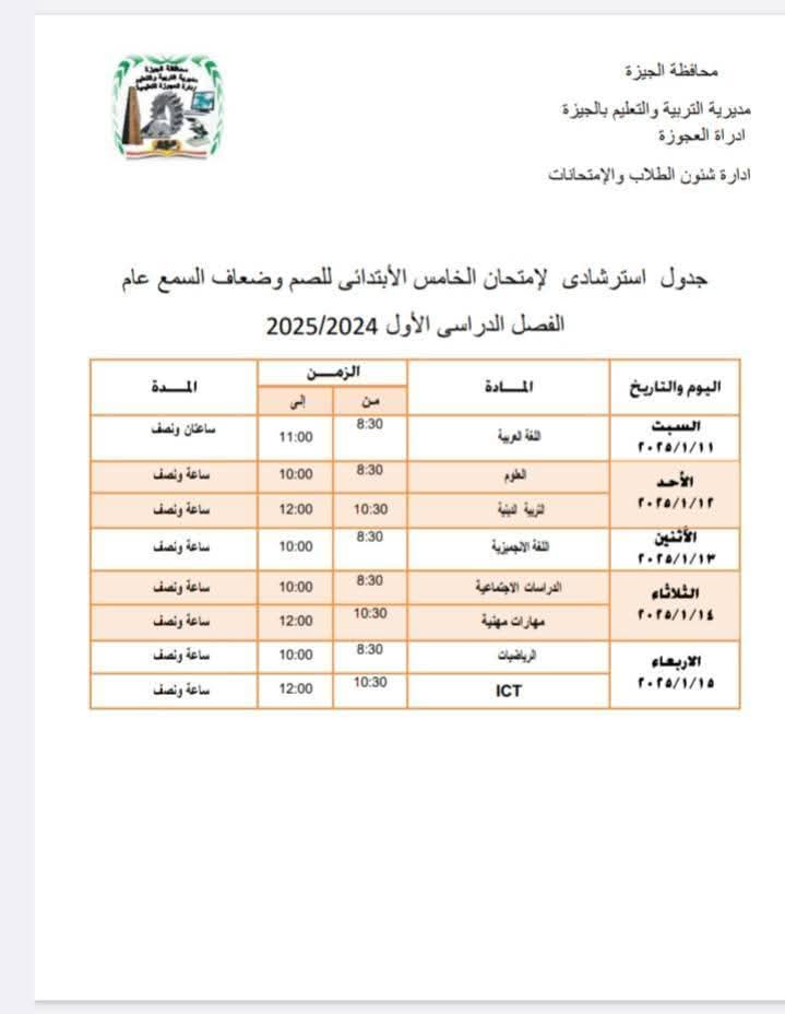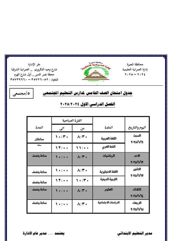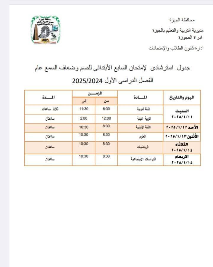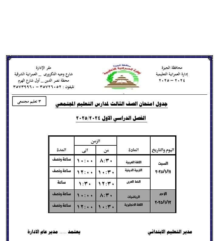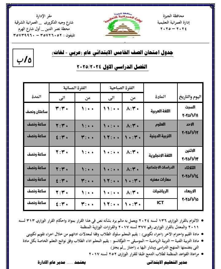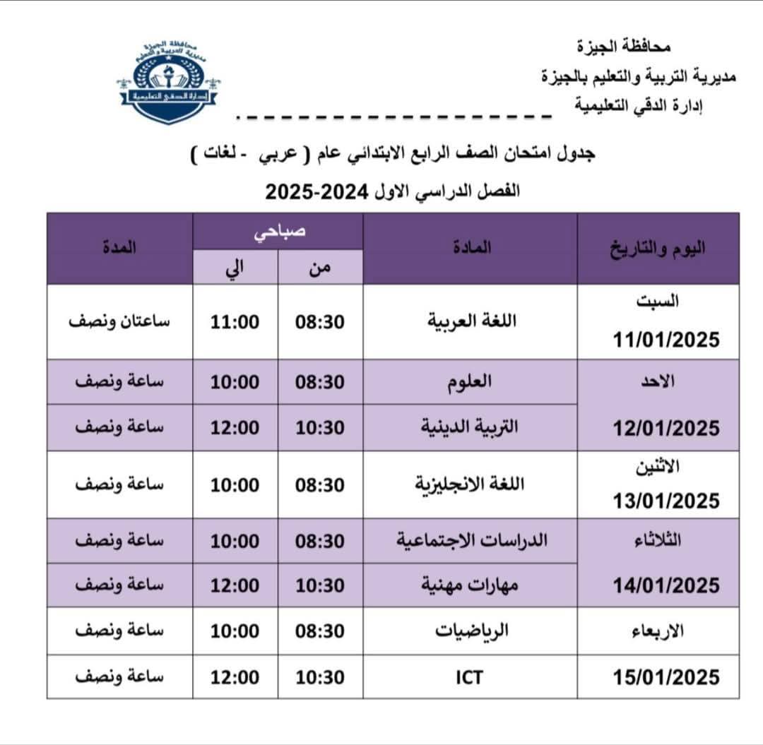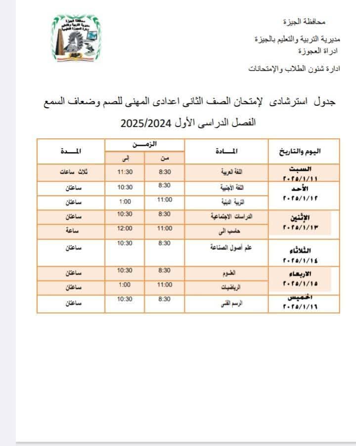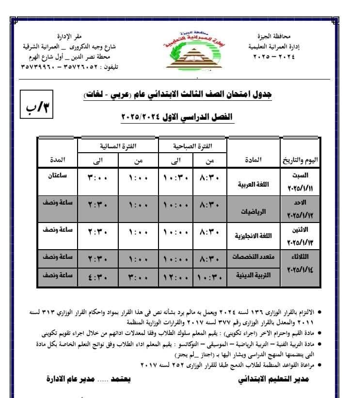 جداول امتحانات الفصل الدراسي الأول لطلاب الهرم والعمرانية والدقي والعجوزة