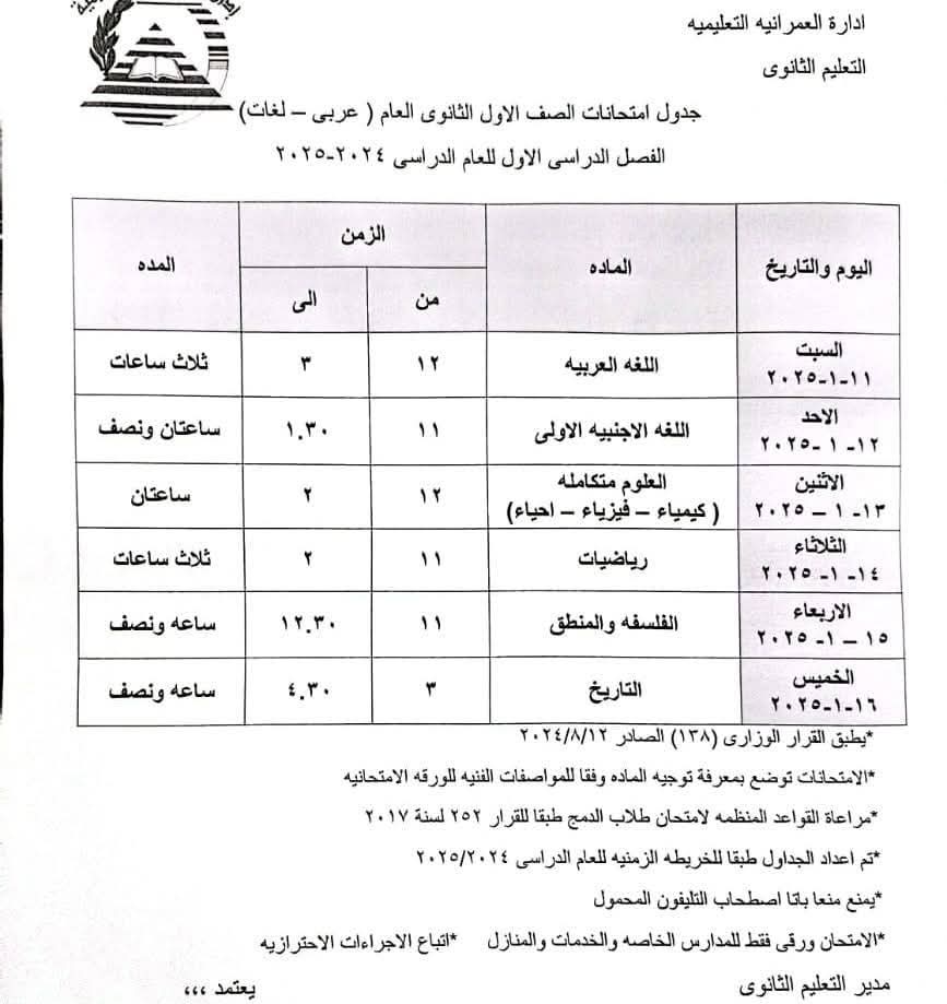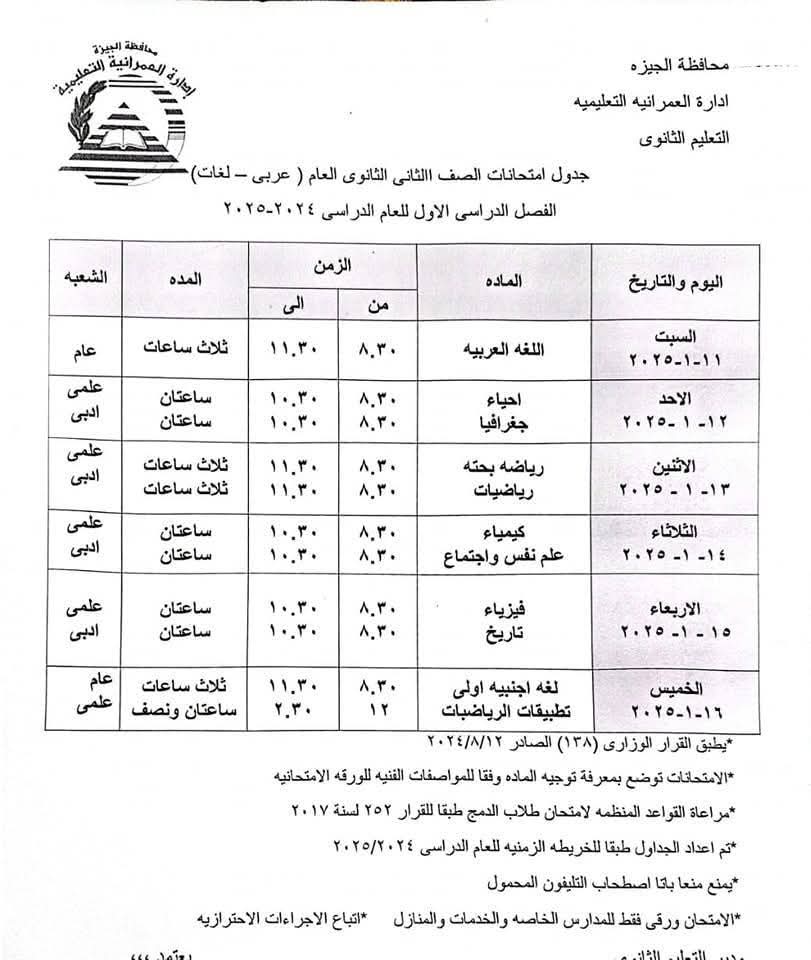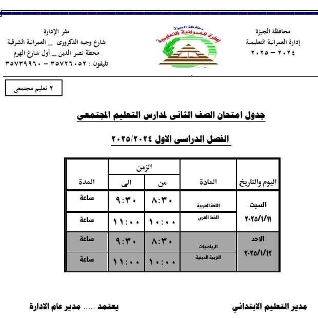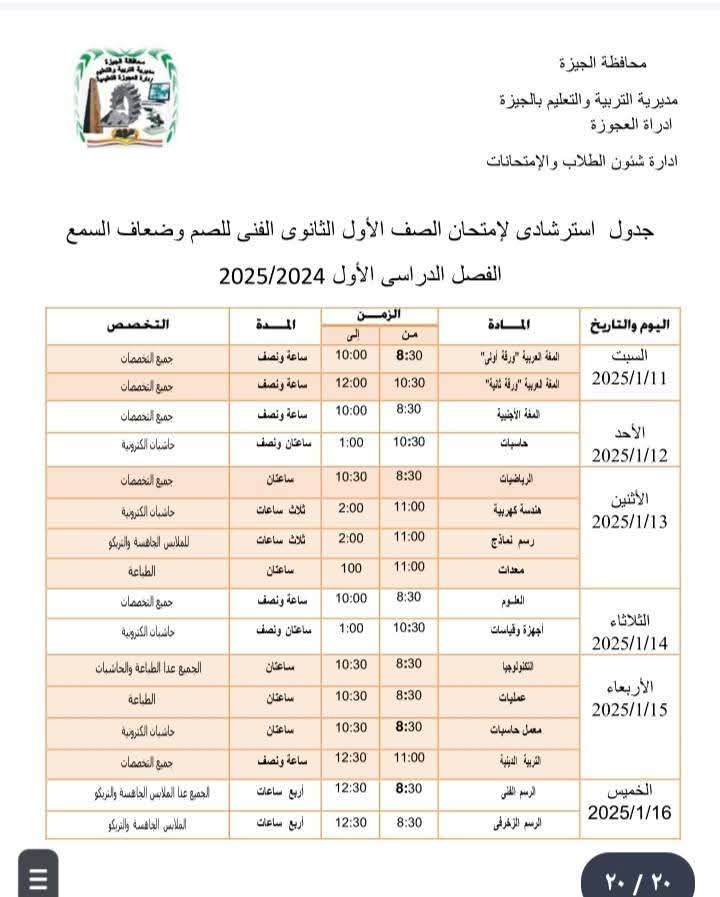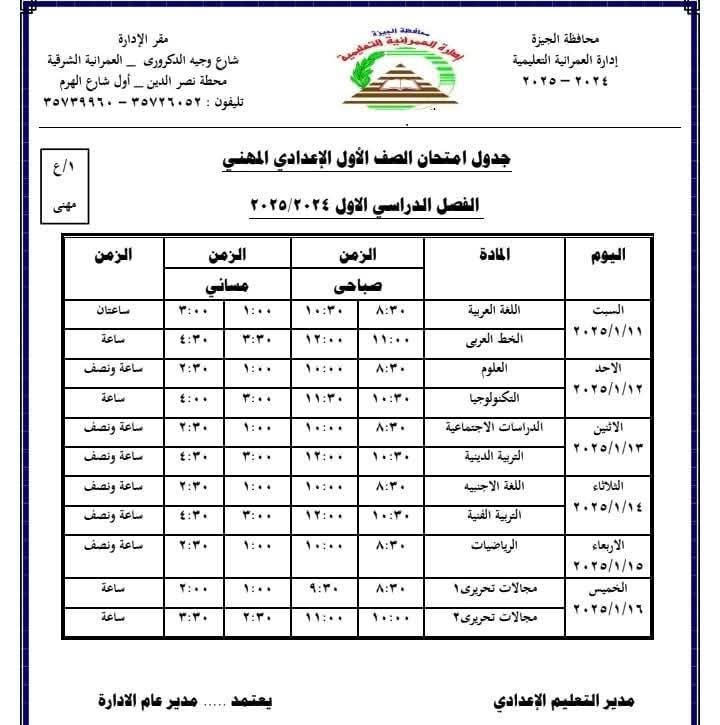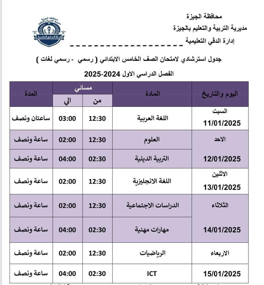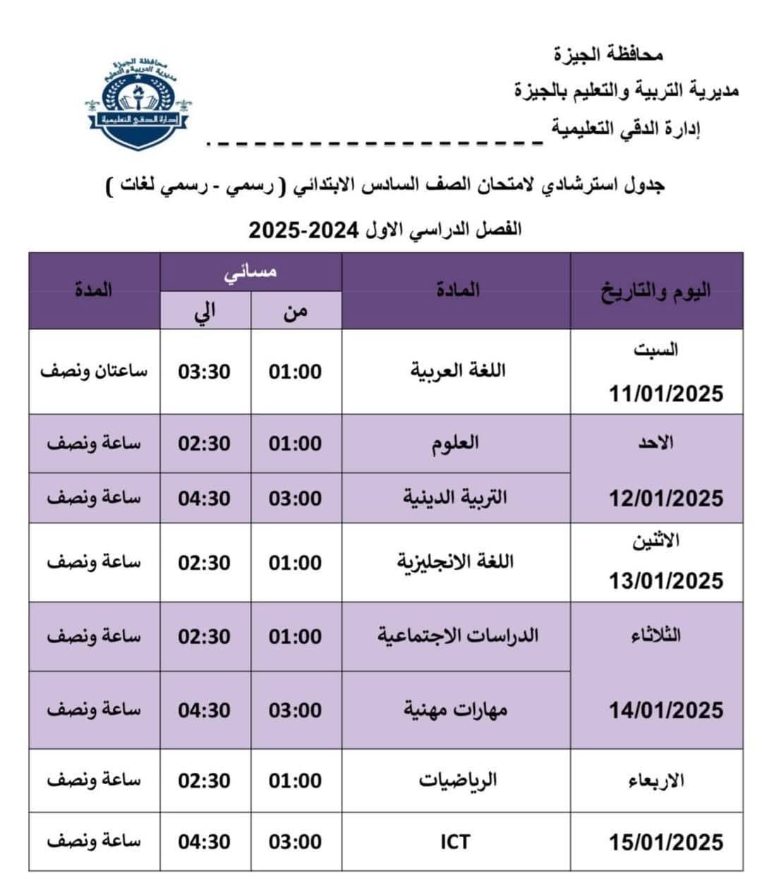 جداول امتحانات الفصل الدراسي الأول لطلاب الهرم والعمرانية والدقي والعجوزة
