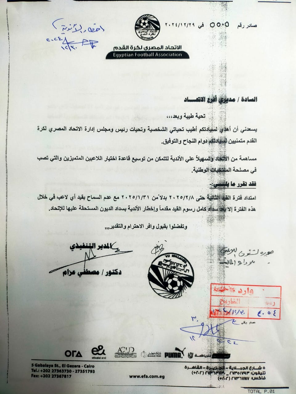 الدوري المصري، أخطر اتحاد الكرة، الأندية بمد الفترة الثانية للقيد الشتوي رسميًّا حتى 8 فبراير 2025، بدلًا من 31 يناير المقبل.