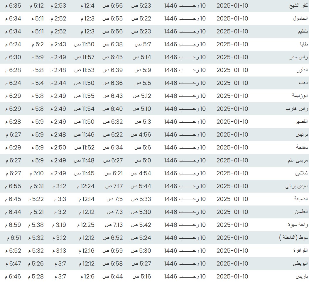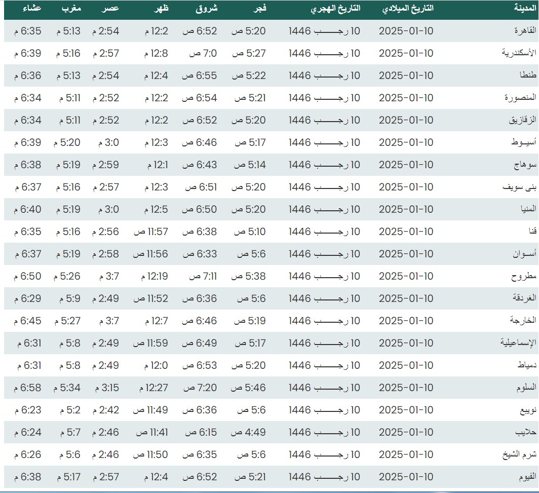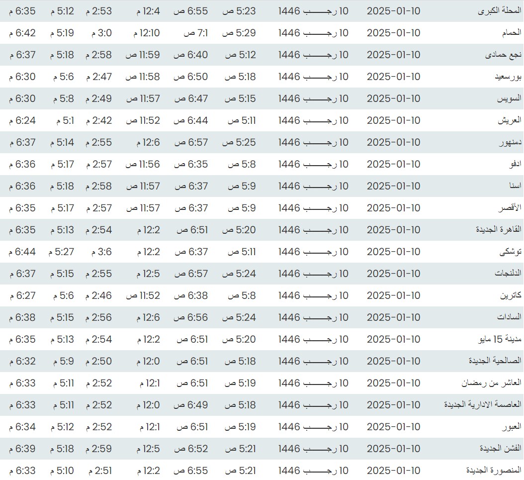 وفيما يلي مواقيت الصلاة، لعدد من مدن ومحافظات الجمهورية من واقع بيانات الهيئة العامة للمساحة