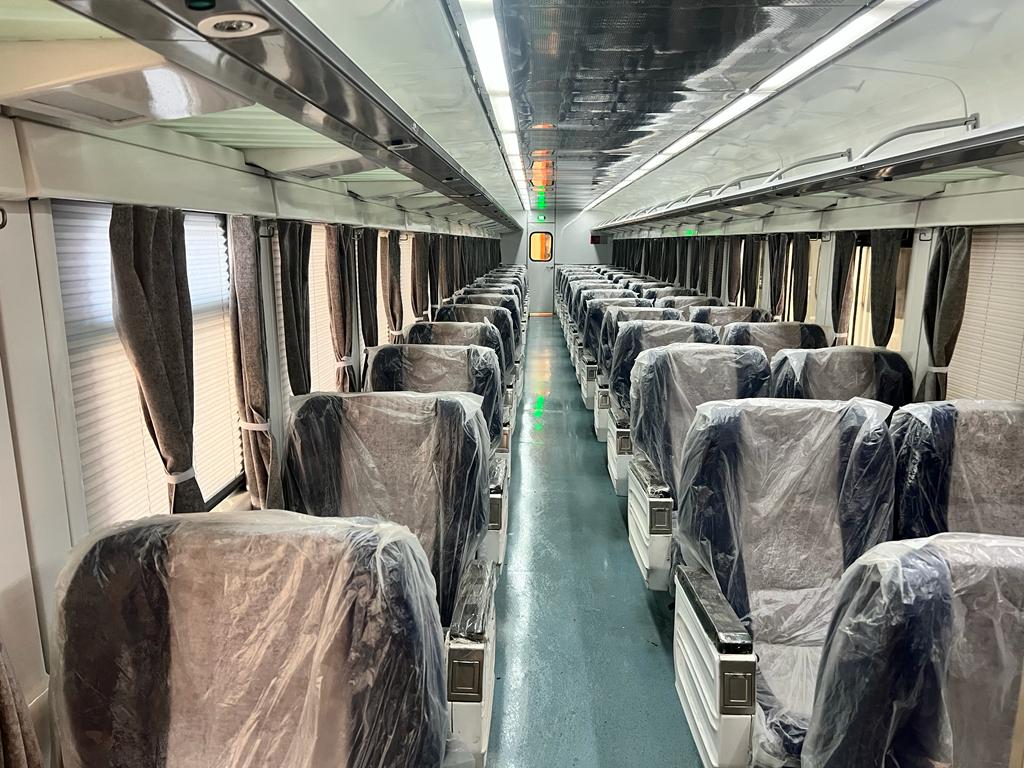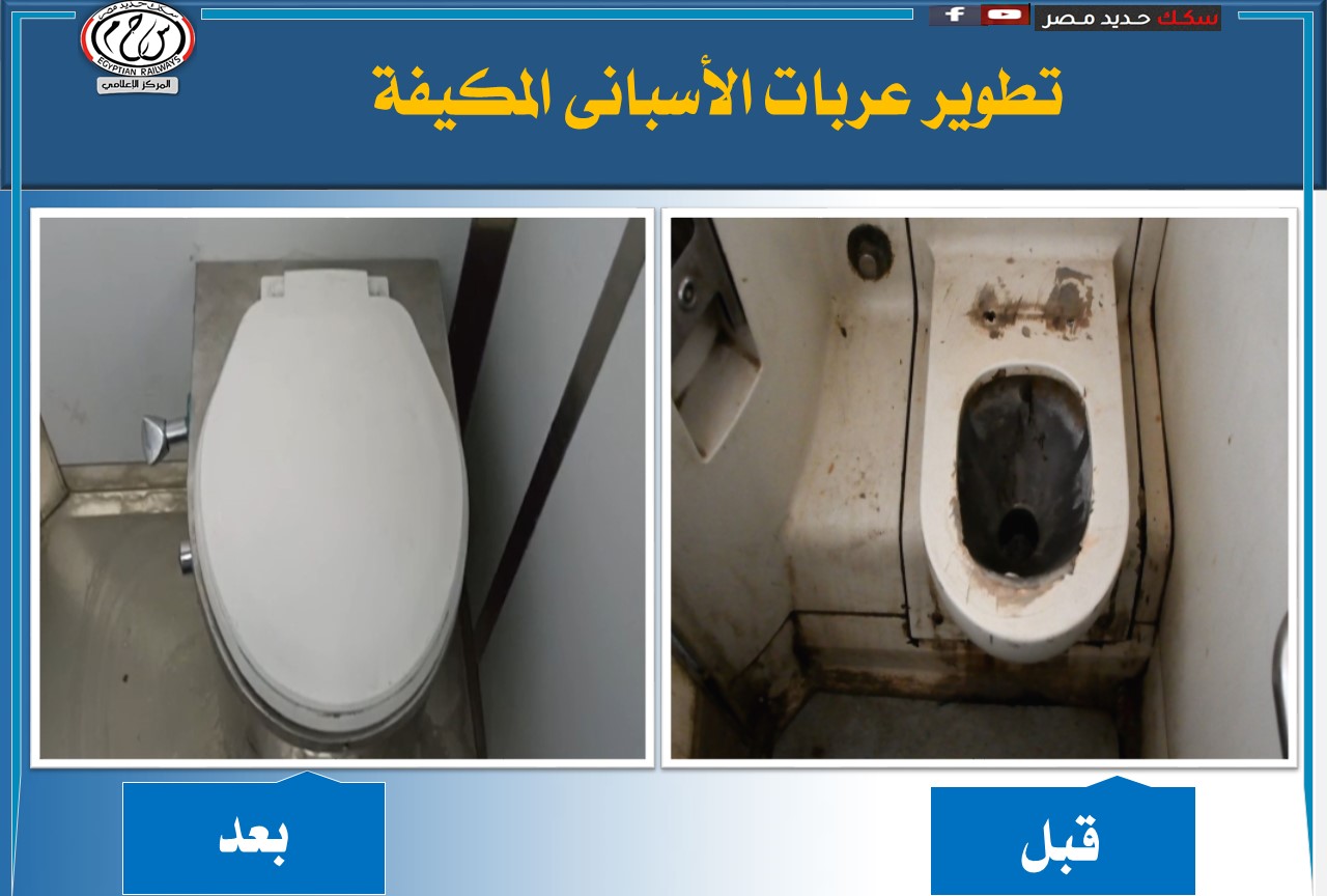 بدأت الجولة بتفقد الوزير لأحد القطارات الإسباني الجاري إعادة تأهيلها وتطويرها وتحديثها بالكامل، حيث يتم تغيير وتجديد كافة دواخل العربة من مقاعد وأرضيات وشبابيك وستائر وتكييف بالإضافة إلى دهان العربة من الخارج بشكل مميز، حيث شاهد الوزير عربات من الدرجة الأولى والثانية التي تم الانتهاء منها وذلك في إطار مشروع رفع كفاءة عدد 150 عربة إسباني مكيفة وحيث يتكون كل قطار أسباني مكيف من 11 عربة بواقع عدد ( 4) عربات درجة أولى – عدد ( 6) عربات درجة ثانية – عدد (١) عربة بوفيه ودرجة ثانية وحيث تم الإنتهاء من ٤ قطارات بإجمالي (٤٤ عربة) منهم، وتم دخولهم الخدمة، وجار الانتهاء من القطار الخامس على أن يتم إدخال باقي القطارات تباعا بعد إعادة تأهيلها وتطويرها وتحديثها بالكامل لتقديم أعلى مستويات الخدمة لجمهور الركاب.