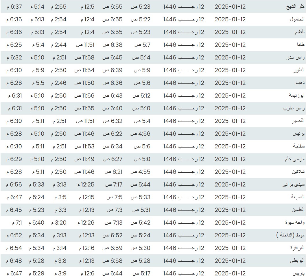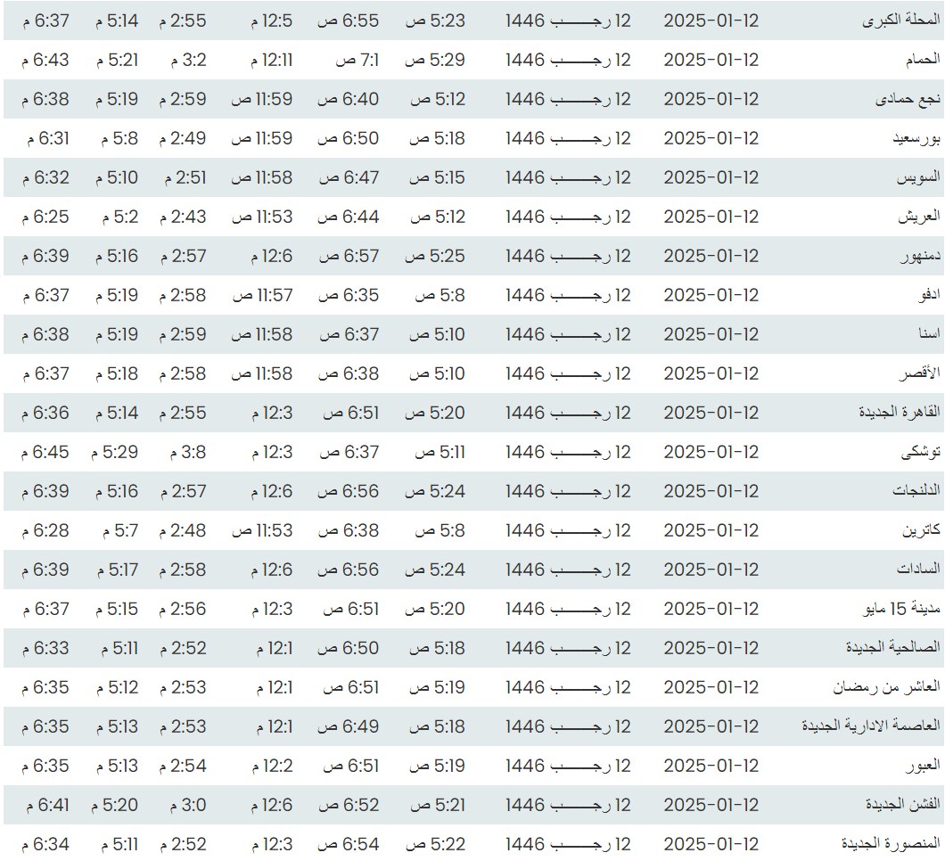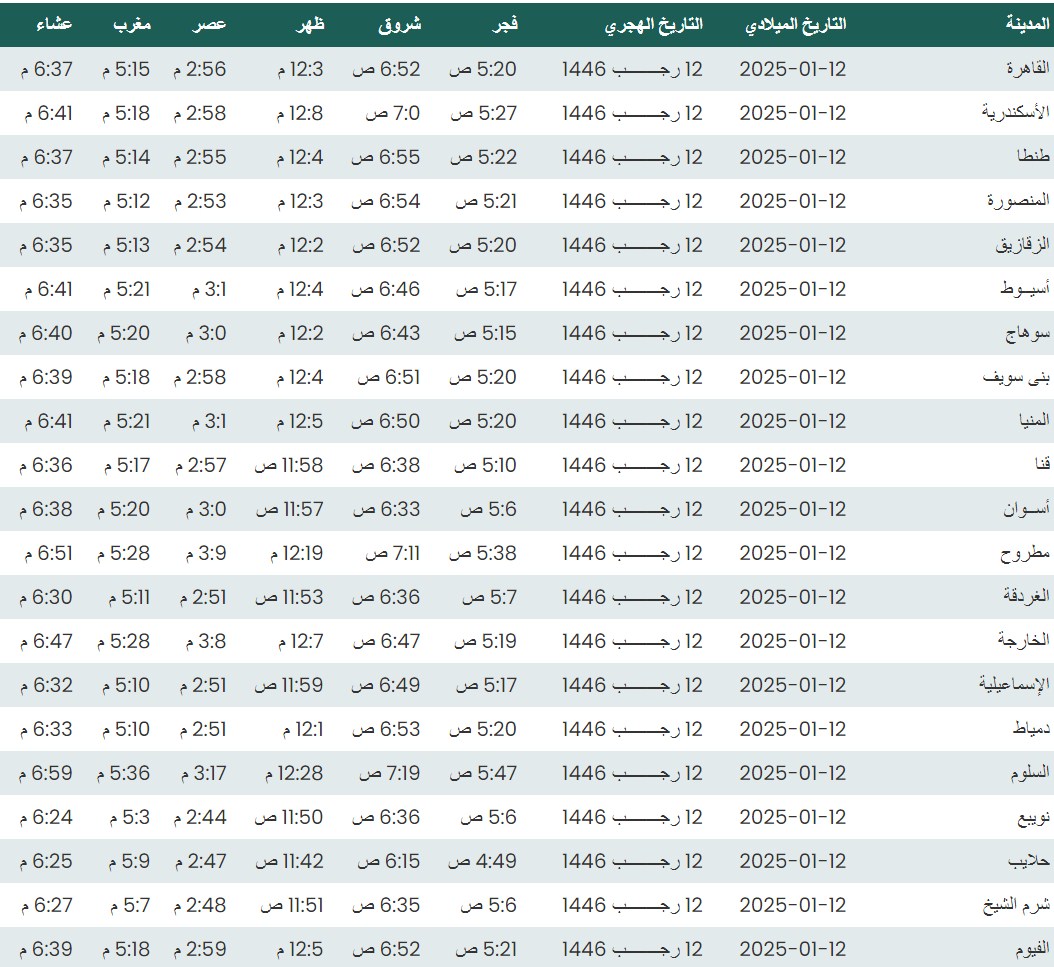 مواقيت الصلاة اليوم الأحد 12 - 1- 2025 في القاهرة والمحافظات