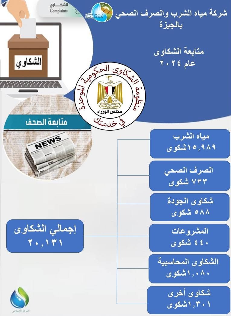 وفي سياقٍ متصل، تعامل فريق متابعة الشكاوى مع الاستفسارات والشكاوى الواردة عبر البوابة الالكترونية لمنظومة الشكاوى الحكومية الموحدة، ووزارة الإسكان، ومحافظة الجيزة، وكذا الصحف، حيث بلغ إجمالي عدد الشكاوى ٢٠.١٣١ شكوى، منها ١٥.٩٨٩ شكاوى مياه، ٧٣٣ شكوى صرف صحي، ١٠٨٠ شكوى محاسبية، ٥٨٨ شكاوى جودة مياه، ٤٤٠ شكاوى مشروعات، ١٣٠١ شكاوى أخرى، فيما تعامل فريق الإعلام مع ٢٥٥ شكوى واستفسار تم رصدها بوسائل الإعلام المرئية والمسموعة والالكترونية.