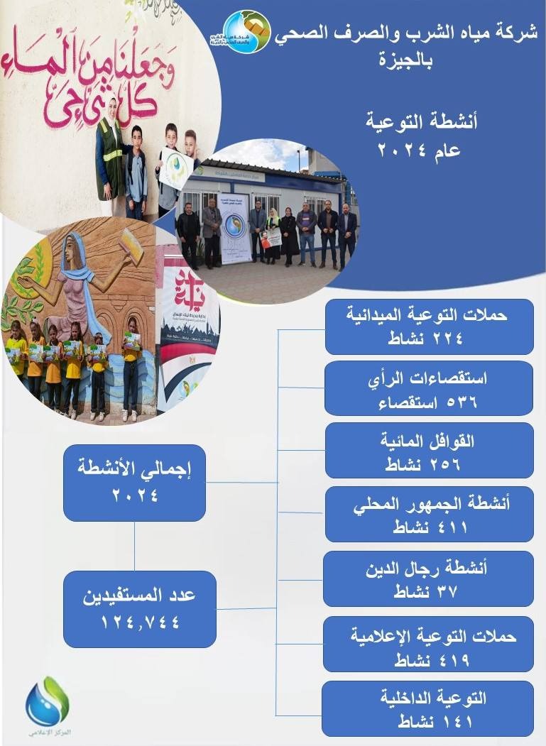وفي إطار مساعي الشركة لرفع الوعي المائي، وتعزيز ثقافة ترشيد استهلاك المياه، والاستخدام الأمثل لشبكات الصرف الصحي، أشار رئيس مياه الشرب بالجيزة، إلى أن فريق التوعية نفذ ٢٠٢٤ نشاطًا توعويًا هذا العام بإجمالي١٢٤.٧٤٤ مستفيدًا من مختلف الفئات العمرية بقرى ومدن محافظة الجيزة، وبالتعاون مع كافة الجهات المعنية بقضية ترشيد استهلاك المياه، في ضوء برامج التوعية المائية، والحملات المتنوعة، والأنشطة التفاعلية، حيث تضمنت حملات التوعية الميدانية ٢٢٤ نشاطًا، ٢٥٦ نشاطًا بالقوافل المائية الشاملة، فيما بلغت أنشطة الجمهور المحلي ٤١١ نشاطًا، ٣٧ نشاطًا بالتعاون مع رجال الدين، ٤١٩ نشاطًا من خلال حملات التوعية الإعلامية عبر وسائل الإعلام الجديد، ١٤١ نشاطًا استهدف التوعية الداخلية العاملين.