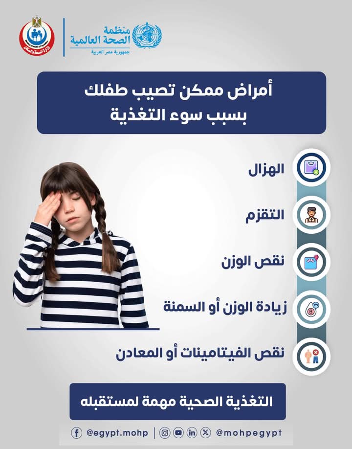 كشفت وزارة الصحة عن أهم الأمراض التى يمكن أن تصيب الطفل بسبب سوء التغذية.
