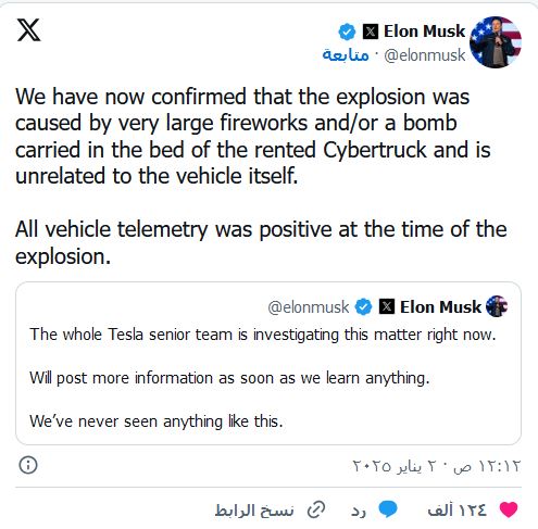 وقال ماسك في منشور على حسابه الرسمي في "إكس" إنه "من المرجح أن يكون (الانفجار) عملًا إرهابيًّا".