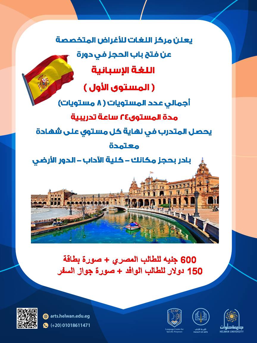 أعلن مركز اللغات للأغراض المتخصصة بكلية الآداب بجامعة حلوان عن فتح باب التسجيل في دورة اللغة الإسبانية (المستوى الأول)، وذلك تحت رعاية الدكتور السيد قنديل رئيس الجامعة، والدكتورة مها حسني عميد كلية الآداب، والدكتورة أماني السيد وكيل الكلية، وبإشراف الدكتور شادي الكردي مدير المركز.