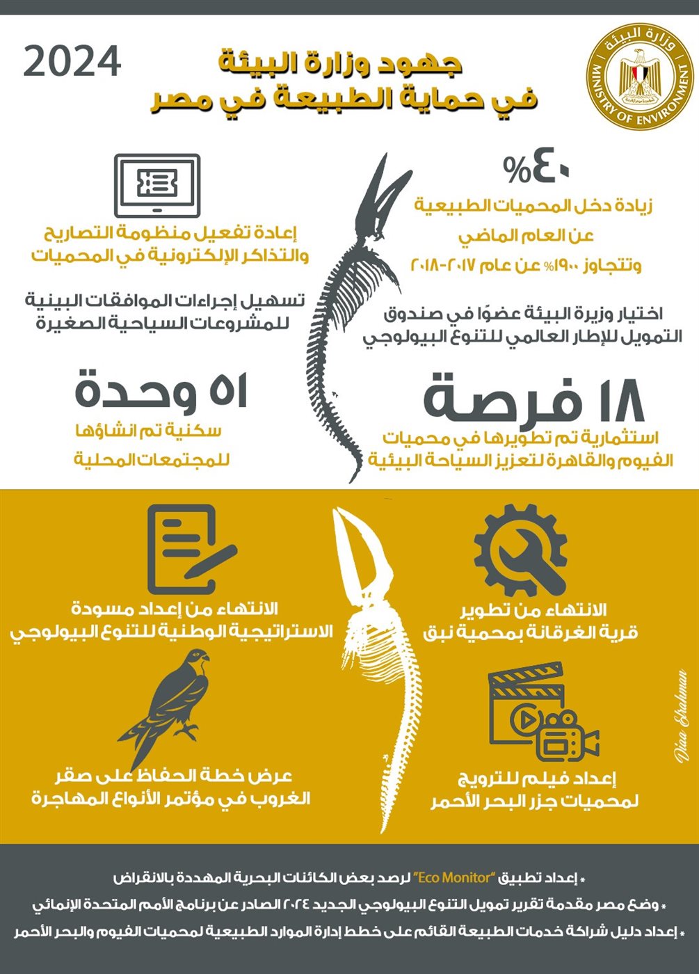 ولفتت وزيرة البيئة إلى أن عام 2024 شهد إعادة تفعيل منظومة التصاريح والتذاكر الإلكترونية في المحميات بالتعاون مع مشروع “شرم خضراء” كما تم إعداد تطبيق “Eco Monitor” بالتعاون مع غرفة الغوص والأنشطة البحرية بهدف رصد بعض الكائنات البحرية المهددة بالانقراض، ويتيح التطبيق الفرصة لقطاع الغوص وممارسي الأنشطة البحرية المشاركة في جهود رصد وصون التنوع البيولوجي البحري بالتعاون مع مشروع “شرم خضراء”. كذلك تم إعداد الدليل الإرشادي لتدريب فريق عمل المحميات الطبيعية على أحدث أساليب الإدارة وعقد دورة تدريبية بالتعاون مع مشروع دمج صون التنوع البيولوجي بالسياحة في مصر مع إعداد دراسة عن كيفية تطبيق مفهوم استعاضة التنوع البيولوجي في مصر. كما تم إزالة التعديات على أراضي بمحمية وادي الأسيوطي لإنفاذ القانون.