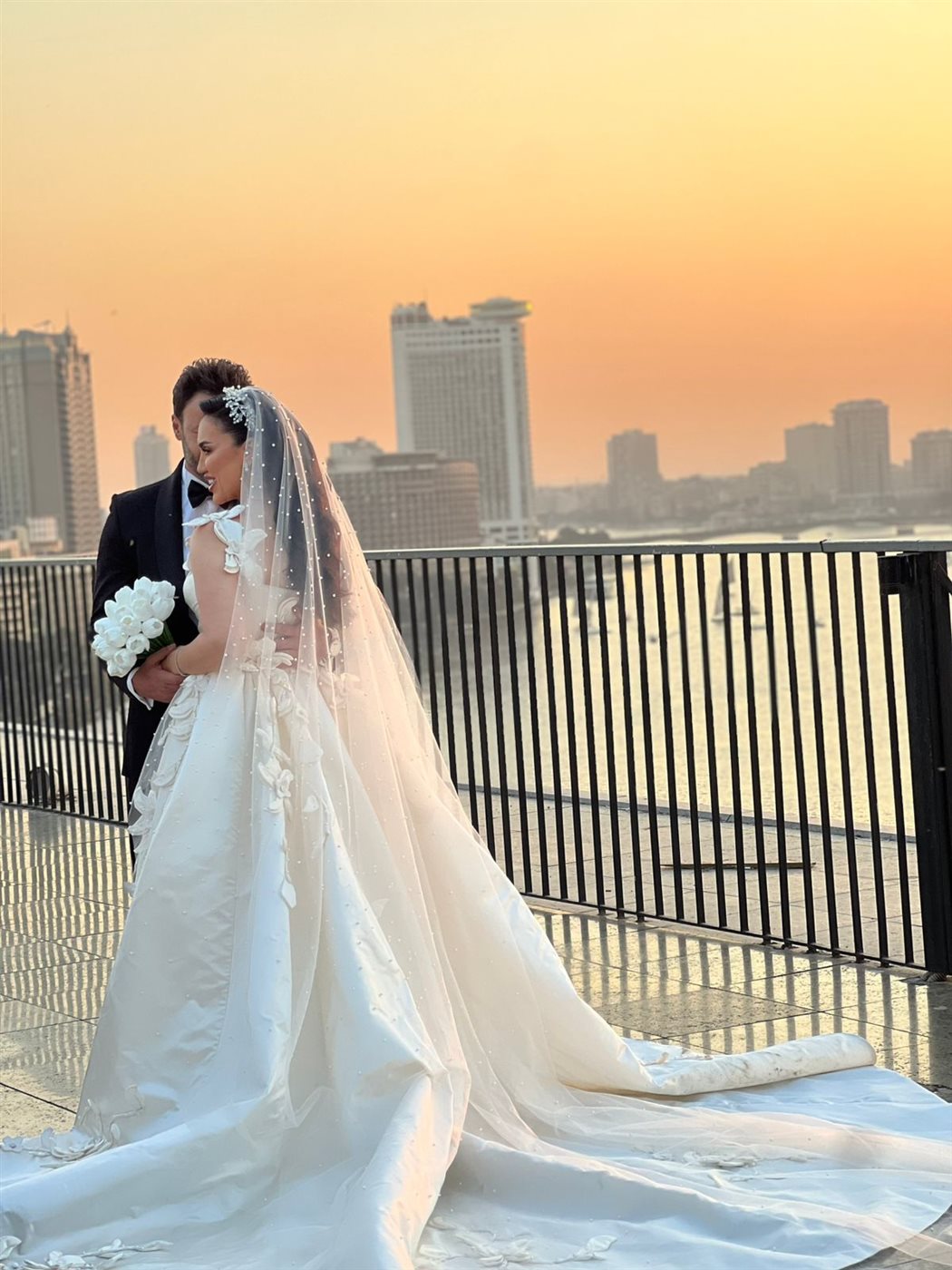 وتألق العروسان محمد العمروسي ومي فاروق، وجاء فستان زفاف مي فاروق بتوقيع مصمم الأزياء أيمن لحموني.