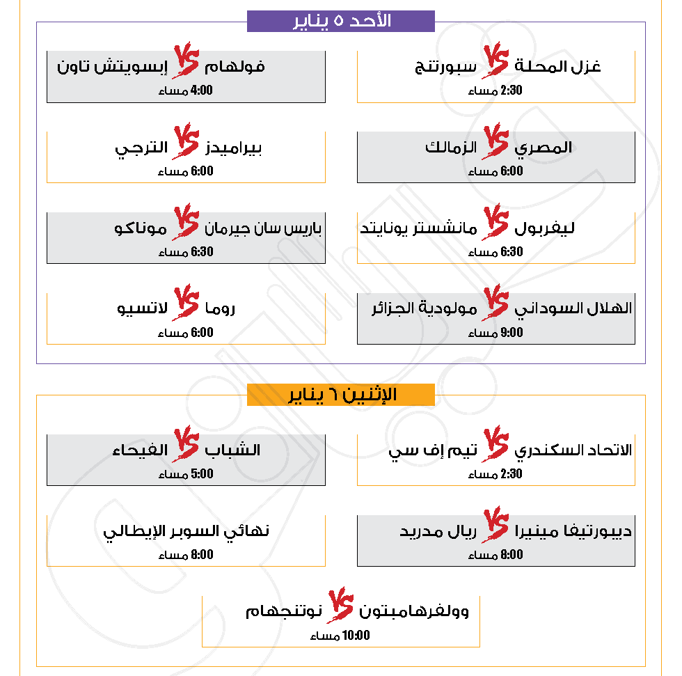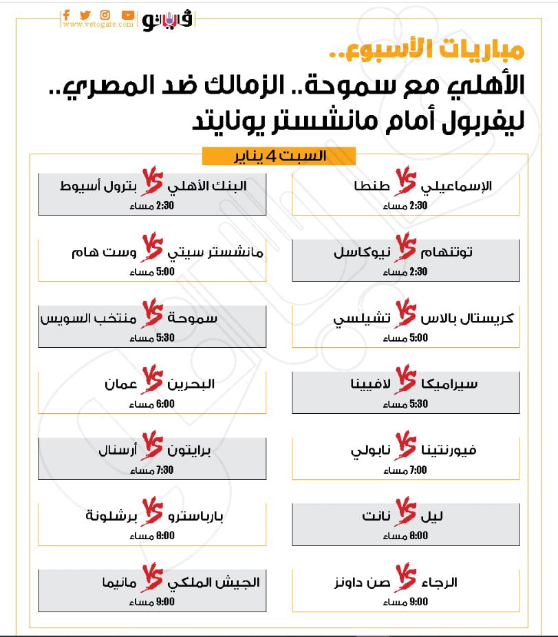مباريات الأسبوع، الأهلي مع سموحة.. الزمالك ضد المصري.. ليفربول أمام مانشستر يونايتد (إنفوجراف)