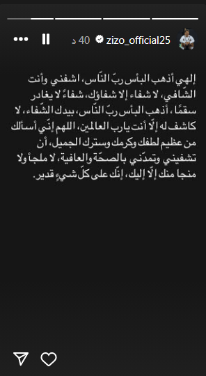 ونشر زيزو منشورًا "ستوري" عبر صفحته الشخصية على موقع التواصل "إنستجرام" قال فيه: "إلهي أذهب البأس رب الناس، اشفني وأنت الشافي، لا شفاء إلا شفاؤك، شفاء لا يغادر سقما، أذهب البأس رب الناس، بيدك الشفاء، لا كاشف له إلا أنت يارب العالمين، اللهم إني أسألك من عظيم لطفك وكرمك وسترك الجميل، أن تشفيني وتمدني بالصحة والعافية، لا ملجأ ولا منجا منك إلا إليك، إنك على كل شيء قدير".