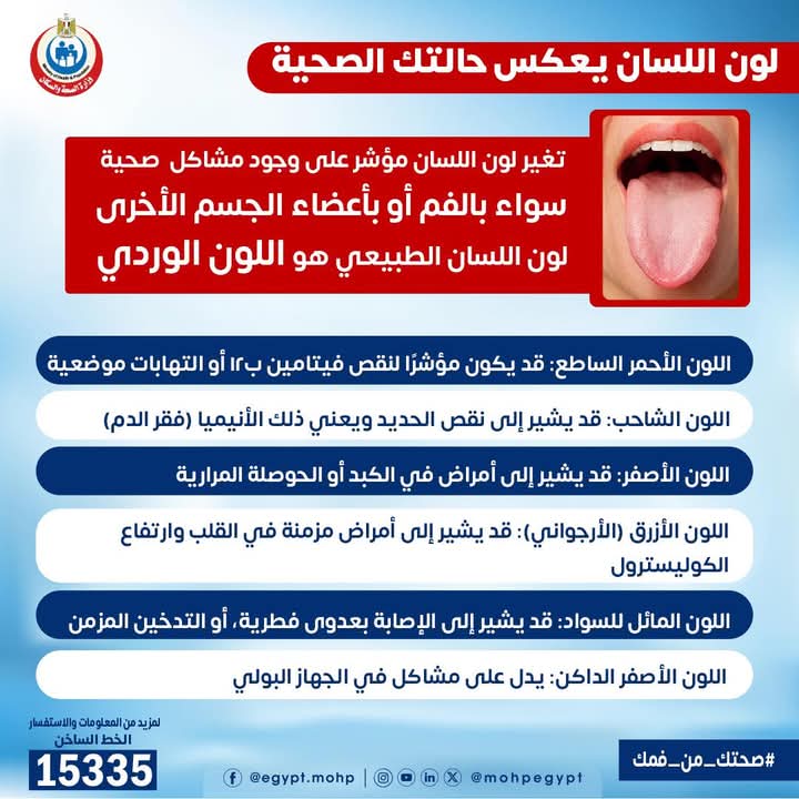 وقالت وزارة الصحة إن تغير لون اللسان يمكن أن يكون مؤشر على وجود مشاكل صحية سواء بالفم أو بأعضاء الجسم الأخرى.