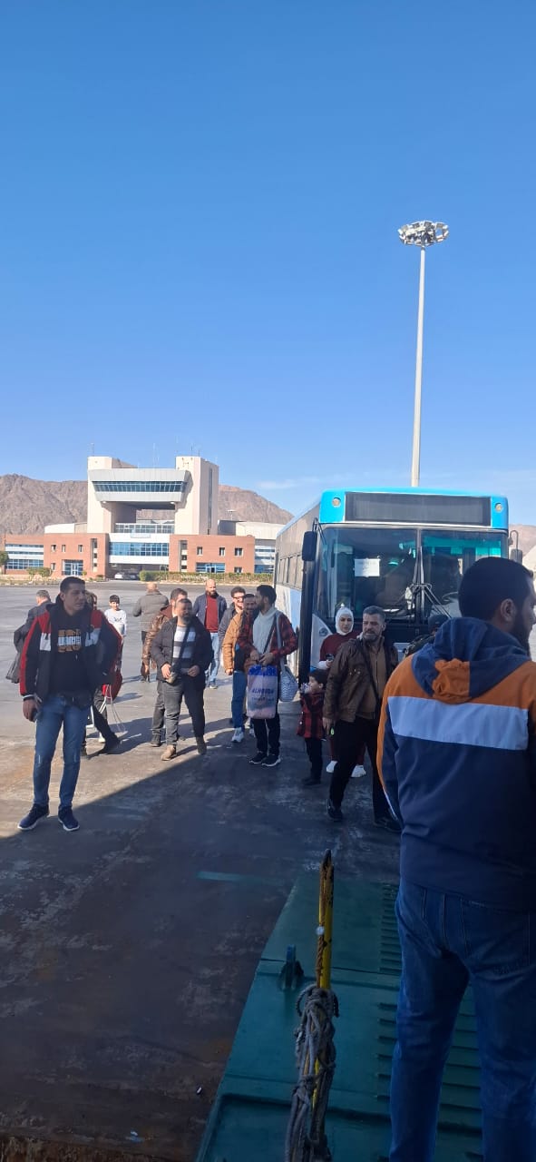 غادر بميناء نويبع البحري لليوم ثاني فوج من الأشقاء السوريين العائدين إلى بلادهم، وعددهم 63 شخصًا على متن العبارة آيلة حيث تم نقلهم من أماكن إقامتهم بالقاهرة إلى الميناء من خلال (2) باص.