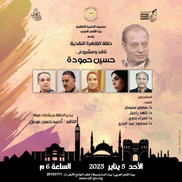حيث تعقد الحلقة لمناقشة المشروع النقدي للأكاديمي والناقد حسين حمودة، وذلك في السادسة مساء الأحد 5 يناير.