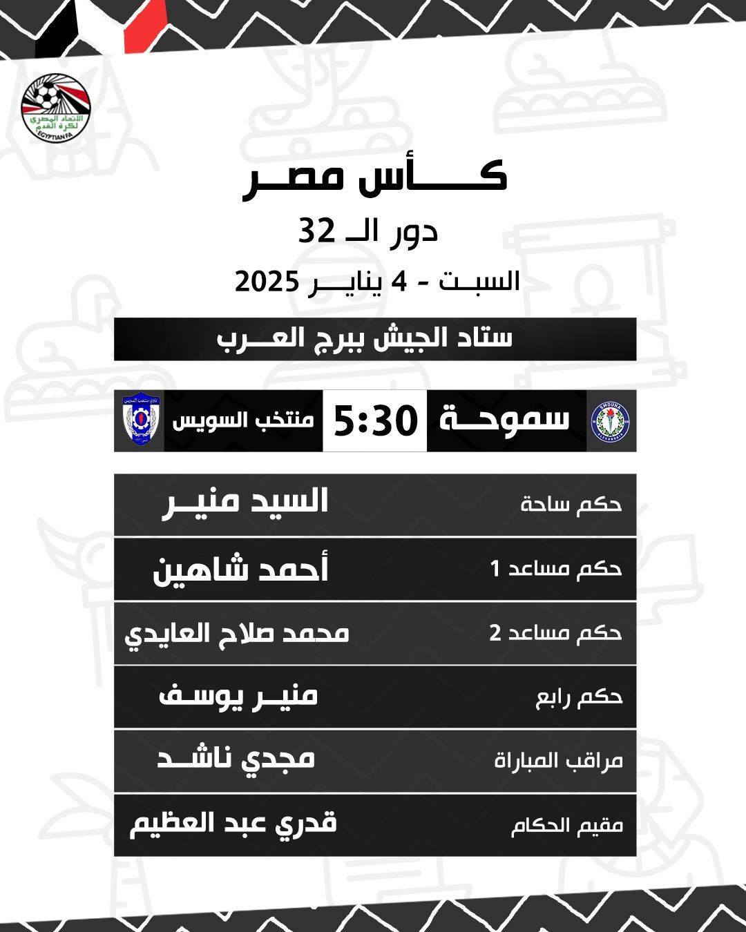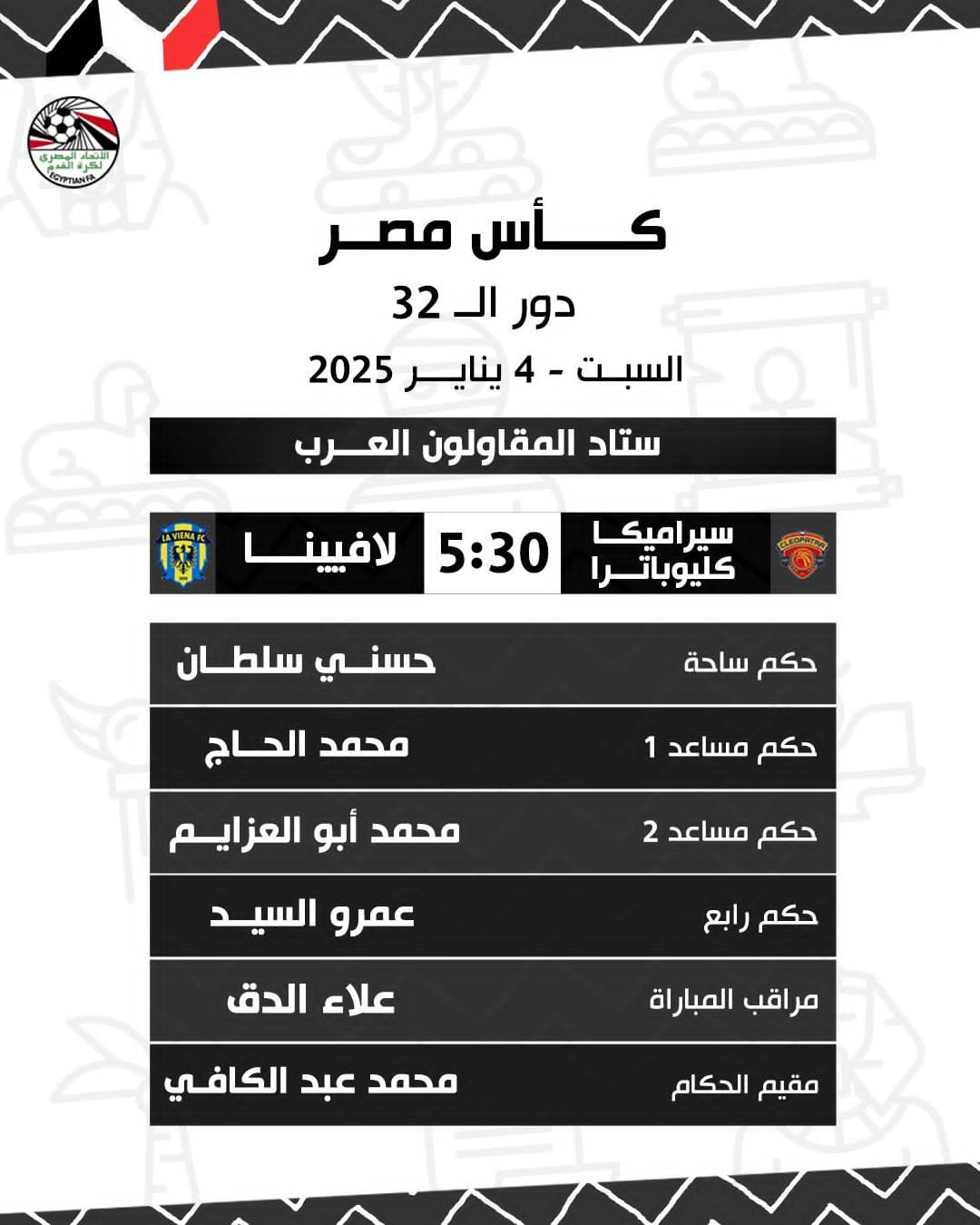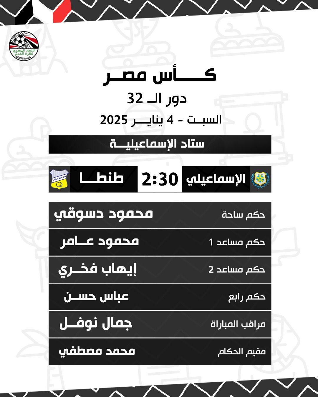 كأس مصر، أعلنت لجنة الحكام الرئيسية باتحاد الكرة، أسماء حكام مباريات اليوم السبت، ضمن مواجهات دور الـ32 من مسابقة كأس مصر للموسم الحالي 2024 - 2025 على النحو التالي: