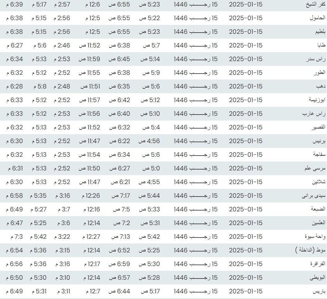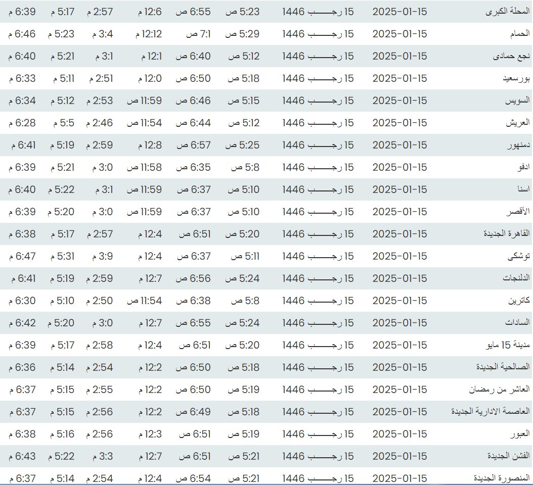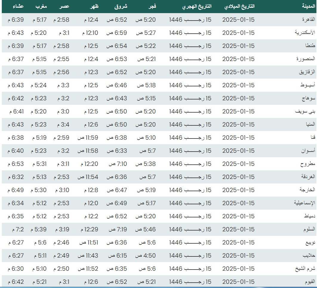 وفيما يلي مواقيت الصلاة، لعدد من مدن ومحافظات الجمهورية من واقع بيانات الهيئة العامة للمساحة