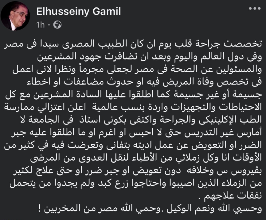 وقال الدكتور الحسيني جميل في قرار اعتزاله الطب، عبر حسابه بالفيس بوك: "تخصصت جراحة قلب يوم أن كان الطبيب المصري سيبدأ في مصر وفي دول العالم، واليوم وبعد أن تضافرت جهود المشرعين والمسئولين عن الصحة فى مصر لجعلي مجرمًا، ونظرًا لأني أعمل في تخصص وفاة المريض فيه أو حدوث مضاعفات أو أخطاء جسيمة، أو غير جسيمة، كما أطلقوا عليها السادة المشرعين مع كل الاحتياطات والتجهيزات واردة بنسب عالمية".