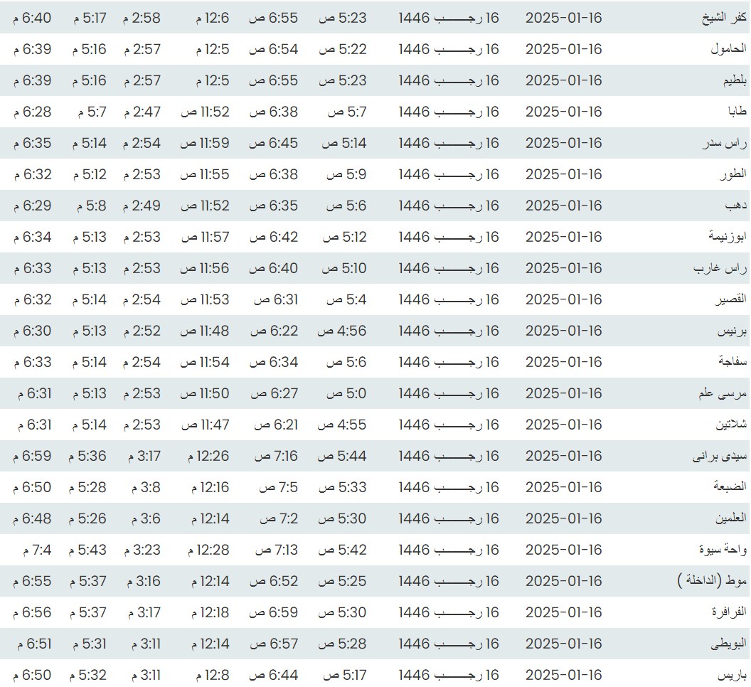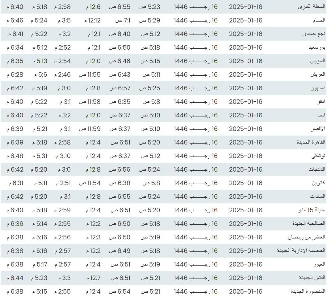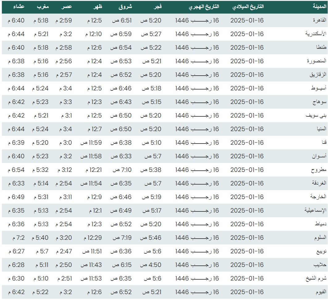 مواقيت الصلاة اليوم الخميس 16 - 1- 2025 في القاهرة والمحافظات