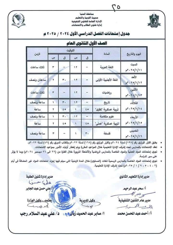جدول امتحانات الترم الأول 2025 للصف الأول الثانوي في المنيا