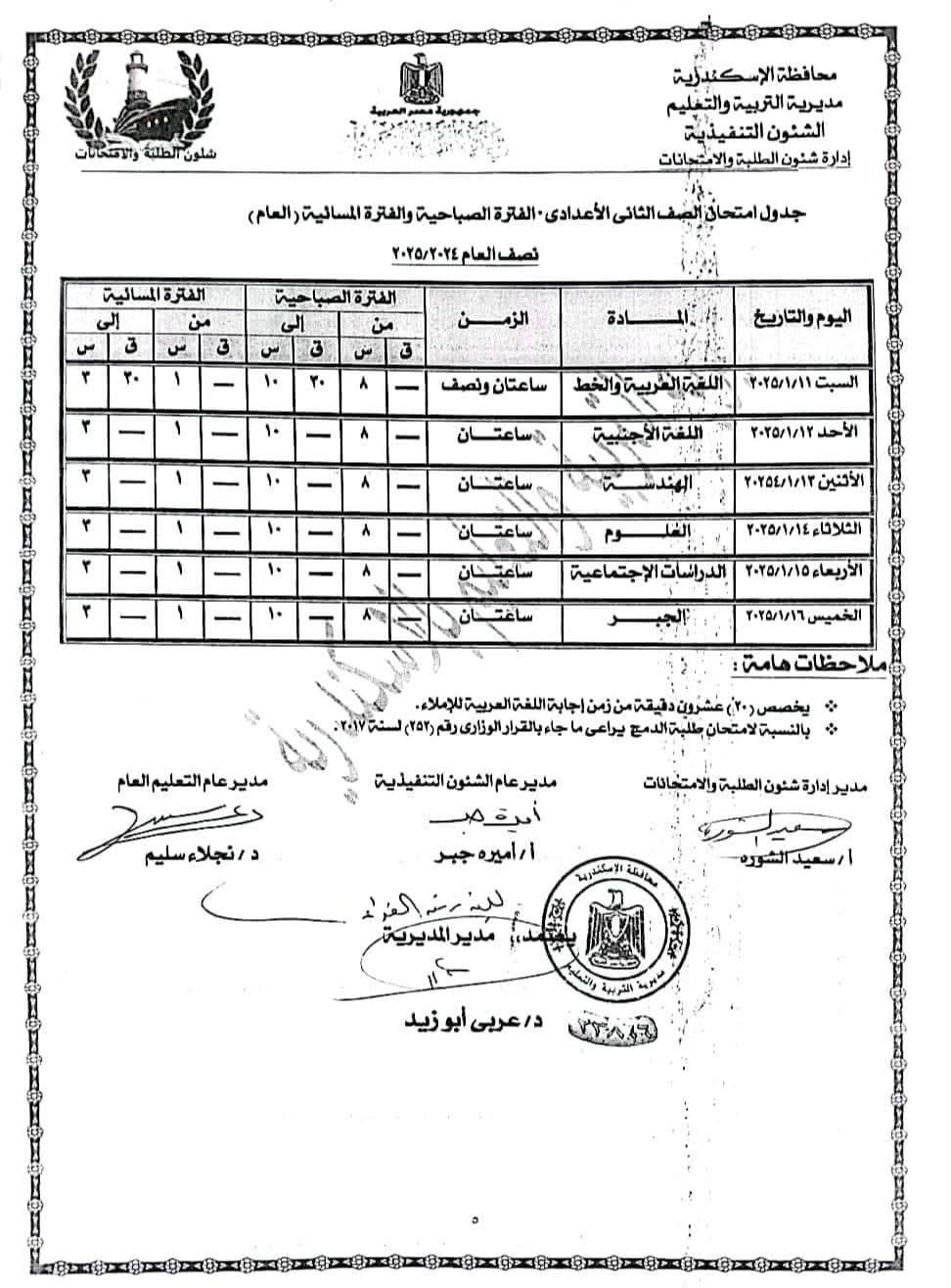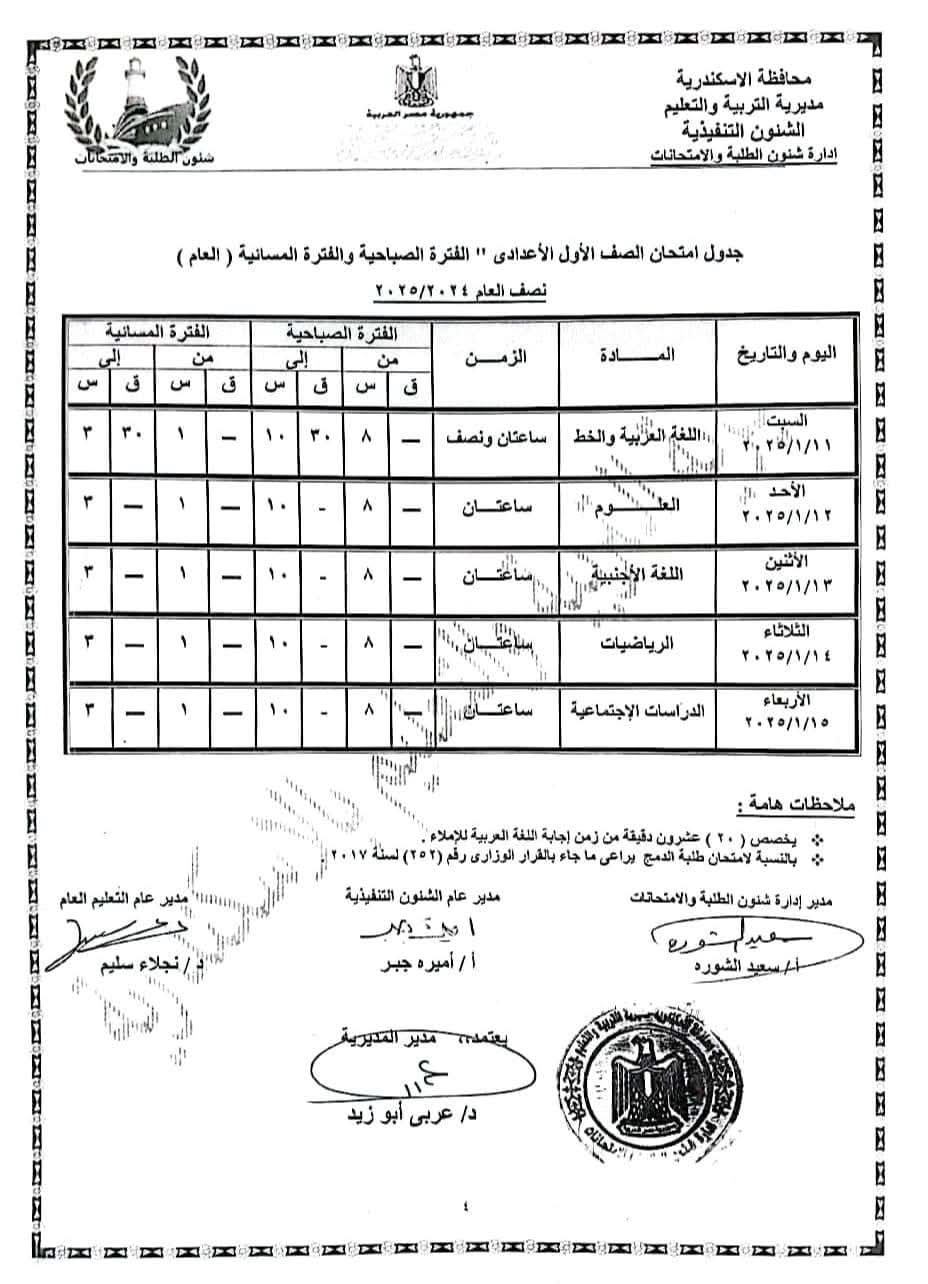 ننشر جدول امتحانات الفصل الدراسى الأول للشهادة الإعدادية في الإسكندرية