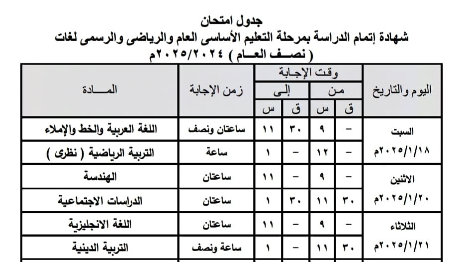 أوضح المهندس ايمن عطية محافظ القليوبية ل«» أنه جرى اعتماد جداول امتحانات الفصل الدراسي الاول «الترم » بمدارس القليوبية لجميع المراحل والمدارس علي أن تنطلق الامتحانات التحريرية 11 يناير وتنتهي 23 من نفس الشهر 2025 وتبدأ إجازة نصف العام في 25 يناير المقبل لمدة أسبوعين مشيرًا أن الجداول كالتالي: