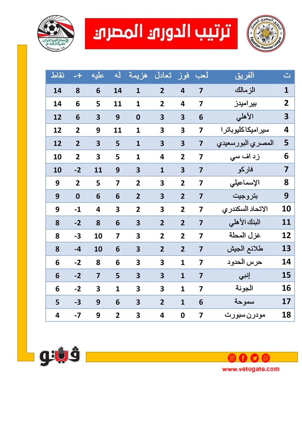 وشهد جدول ترتيب أندية الدوري المصري الممتاز، تقدم فريق الاسماعيلي عدة مراكز في الترتيب، بعد قرار رابطة الأندية باعتماد فوز الدراويش على مودرن سبورت 3-0، بعد قيام الأخير بمخالفة لائحة الدوري الممتاز، وإشراك 6 لاعبين أجانب في مباراة الفريقين التي أقيمت مساء الأربعاء الماضي، وانتهت بالتعادل السلبي بين الفريقين.