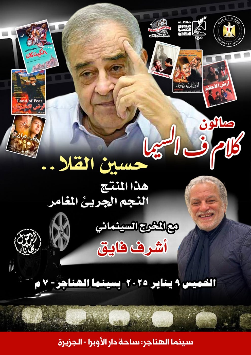 الصالون يقام هذا الشهر بعنوان "حسين القلا.. هذا المنتج النجم الجريء المغامر" ويدير الصالون المخرج السينمائي أشرف فايق.