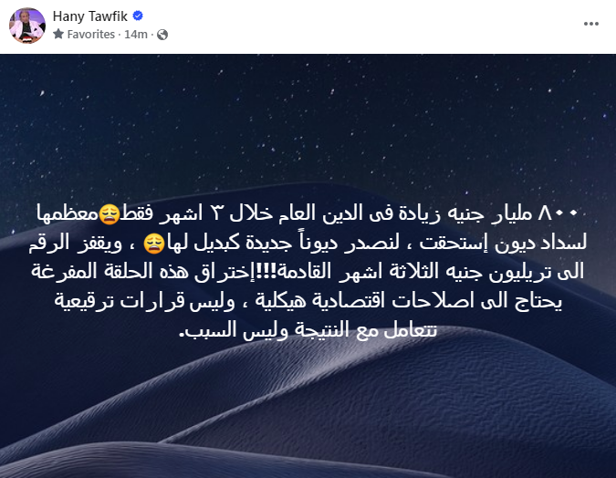 وقال هاني توفيق، عبر حسابه بالفيس بوك، عن زيادة الدين العام: "٨٠٠ مليار جنيه خلال ٣ أشهر فقط معظمها لسداد ديون استحقت، لنصدر ديونًا جديدة كبديل لها، ويقفز الرقم إلى تريليون جنيه الثلاثة أشهر القادمة!".