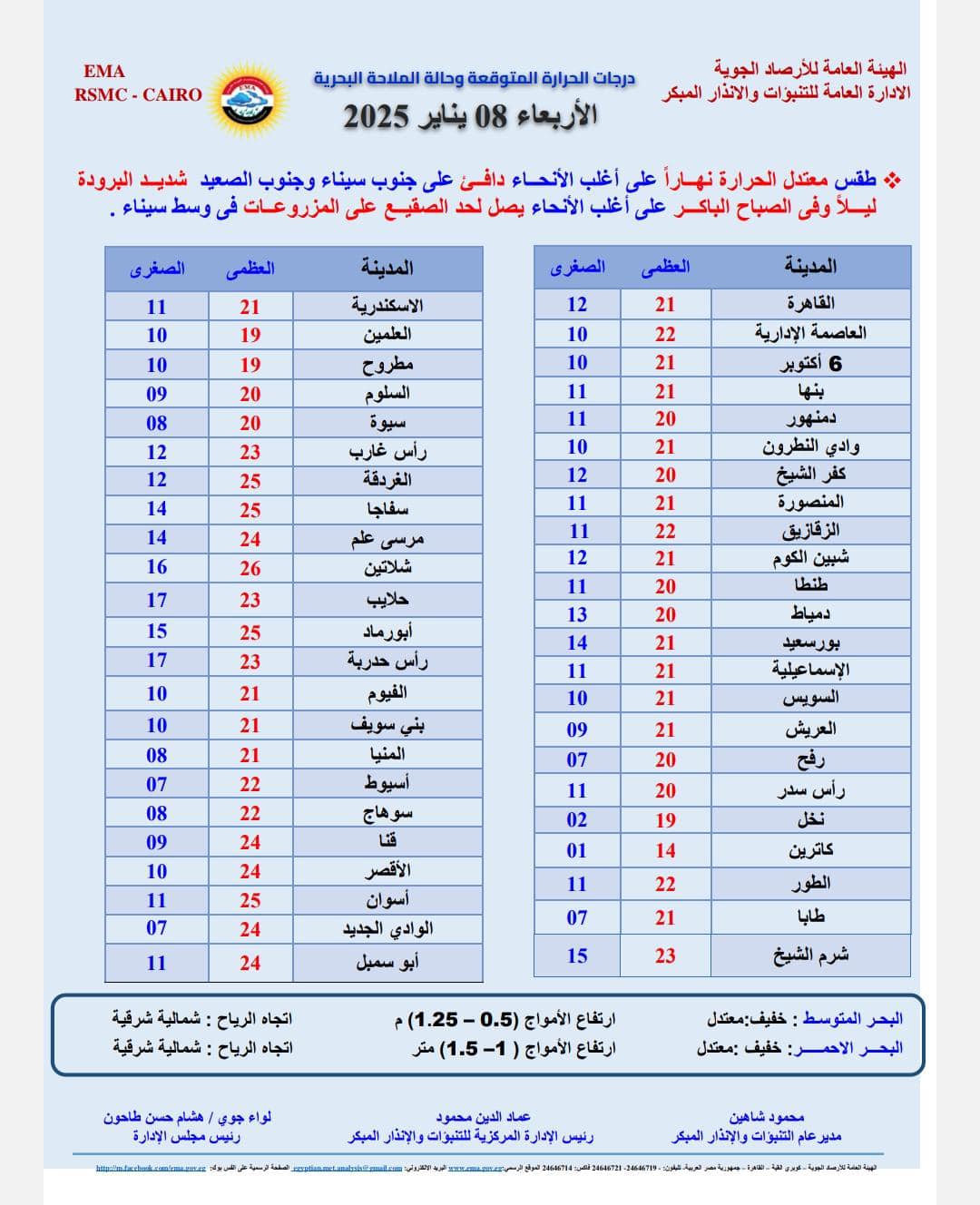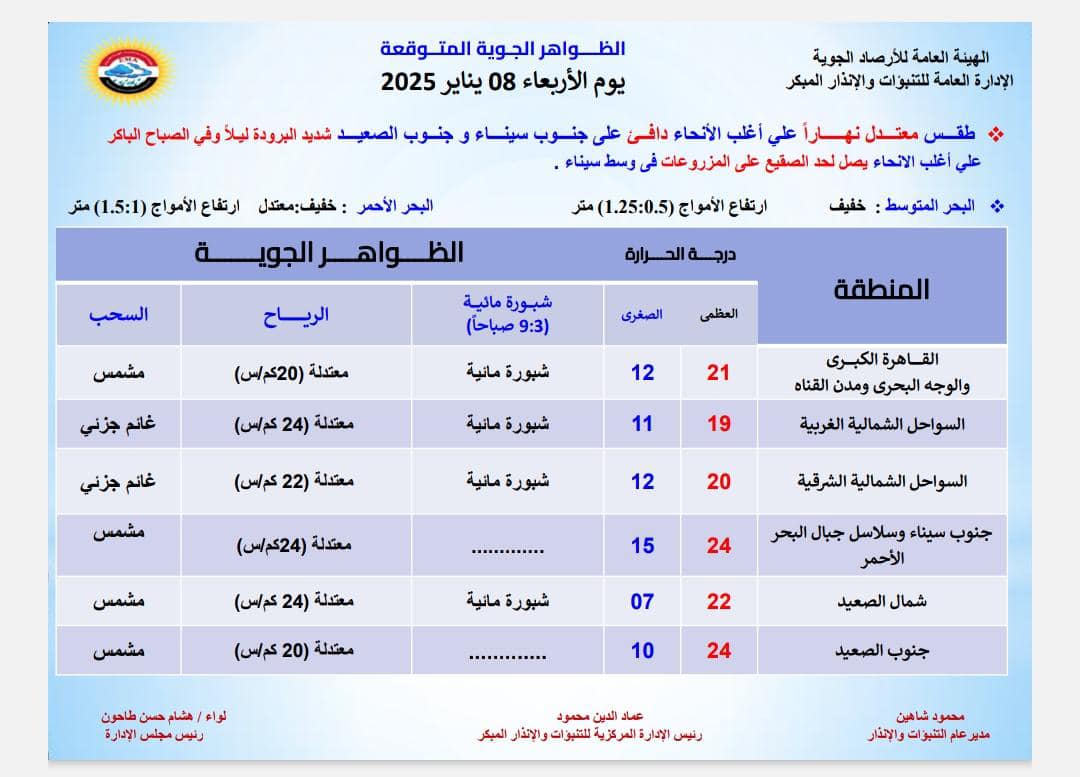 ونشرت هيئة الأرصاد بيانًا بدرجات الحرارة المتوقعة اليوم الأربعاء على مدن ومحافظات مصر، وجاءت كالتالي: