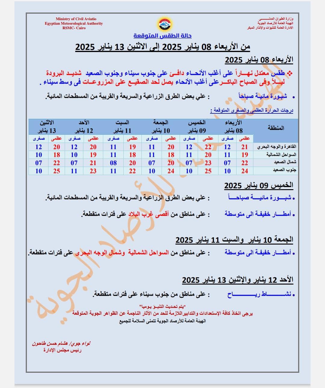 حالة الطقس اليوم الأربعاء 8 يناير 2025