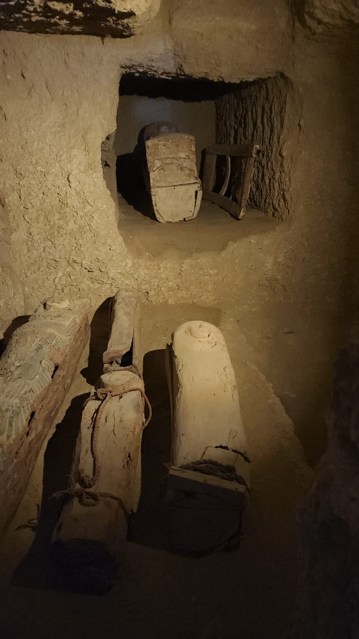 وأوضح "حواس" أنه تم الكشف أيضا عن عدد من أبيار الدفن من عصر الأسرة السابعة عشرة (١٥٨٠ – ١٥٥٠ قبل الميلاد) المنحوتة في الصخر والتي تعود لعصر الأسرة السابعة عشرة وعثر بداخلها على عدد من التوابيت الخشبية بالهيئة الإنسانية والتي تعرف بالتوابيت الريشية وهي المميزة لعصر الأسرة السابعة عشرة ومن أهم تلك التوابيت تابوت لطفل صغير مغلق وموثق بالحبال والتي لا تزال على هيئتها منذ دفنها قبل ٣٦٠٠ سنة. وبجانب تلك التوابيت تم العثور على حصير ملفوف ما زال بهيئته المكتشف عليه وتعد البعثة حاليًا برنامجا خاصا لترميمه ونقله للعرض بمتحف الحضارة، حيث قامت البعثة المصرية بنقل واحد من أهم مكتشفاتها وهو سرير من الخشب والحصير المجدول إلى متحف الحضارة في موسم الحفائر الماضي ٢٠٢٣ – ٢٠٢٤ والذي يعود إلى تلك الفترة وكان يخص أحد حراس الجبانة حيث عثر عليه في حجرة صغيرة مخصصة لإعاشة حرس الجبانة.