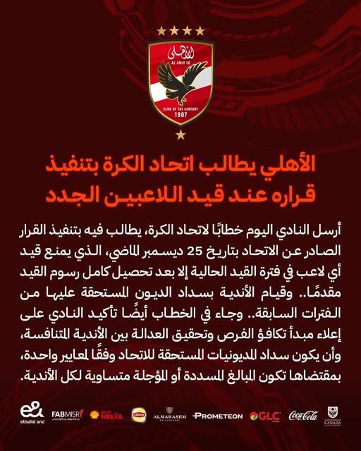 طالب النادي الأهلي، اليوم، في خطاب رسمي إلى الاتحاد المصري لكرة القدم، بتنفيذ القرار الصادر عن الاتحاد بتاريخ 25 ديسمبر الماضي.
