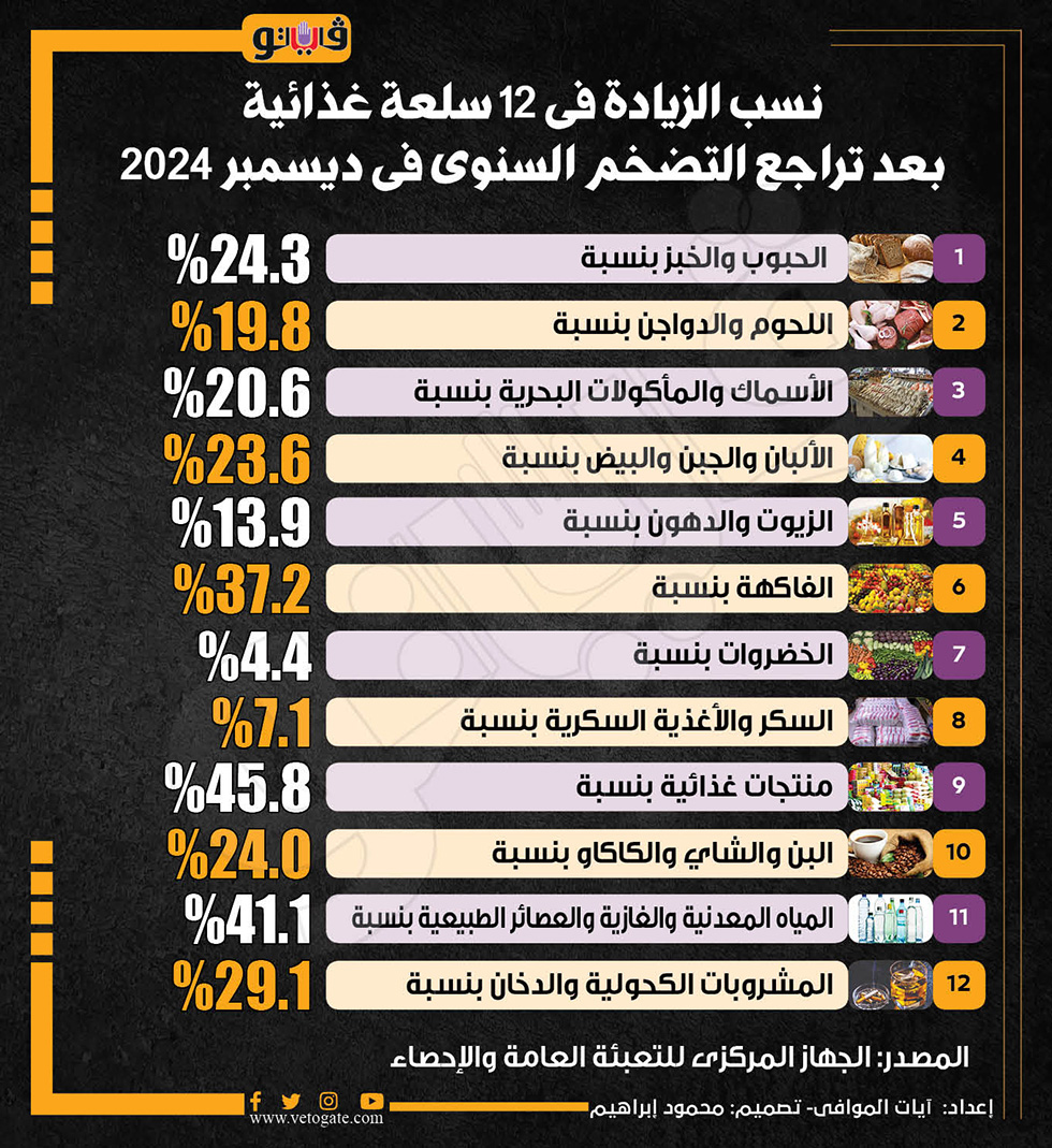نسب الزيادة فى 12 سلعة غذائية بعد تراجع التضخم السنوى فى ديسمبر 2024 (إنفوجراف)