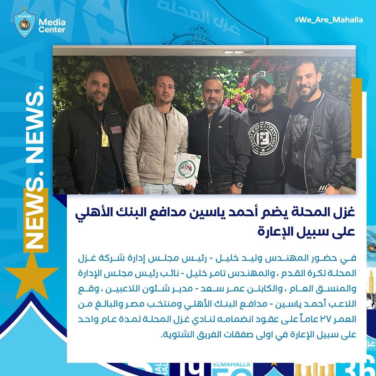 نجح نادي غزل المحلة في التعاقد مع أحمد ياسين مدافع البنك الأهلي علي سبيل الإعارة لمدة عام واحد خلال الانتقالات الشتوية الجارية لتدعيم خط دفاع زعيم الفلاحين.