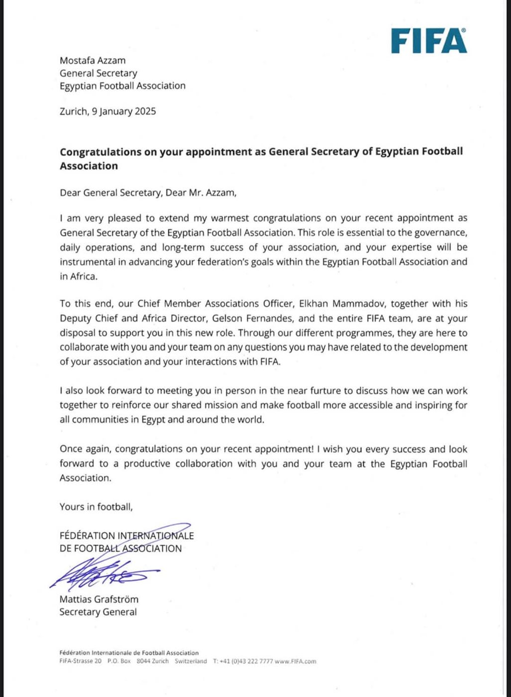 واختتم الأمين العام للفيفا رسالته: "مرة أخرى تهانينا بهذه المناسبة، وأتمنى لك كل النجاح وأتطلع إلى تعاون مثمر معك ومع فريقك في الاتحاد المصري لكرة القدم".