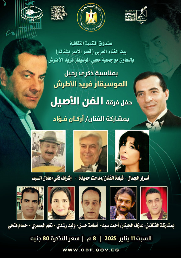ينظم بيت الغناء العربي بقصر الأمير بشتاك بشارع المعز، التابع لقطاع صندوق التنمية الثقافية، بالتعاون مع جمعية محبي الموسيقار فريد الأطرش، حفلًا غنائيًا جديدًا لفرقة "الفن الأصيل" بقيادة الفنان مدحت حميدة وإشراف فني من عادل السيد، وذلك غدا السبت (11 يناير) في تمام الساعة الثامنة مساءً.