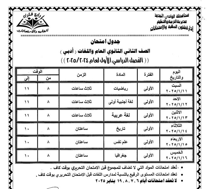 يذكر أن اللواء دكتور محمد الزملوط محافظ الوادى الجديد إعتمد في وقت سابق جداول امتحانات الفصل الدراسي الأول ٢٠٢٤/ ٢٠٢٥, لصفوف النقل بالمرحلة الابتدائية والإعدادية، والمدارس الفنية (تجاري - زراعي -صناعي)، ومنظومة الفصل الواحد، ومدارس الأمل للصم وضعاف السمع، وكذا الشهادة العامة الإعدادية للتعليم العام واللغات ومدارس التربية الخاصة والمهني وذلك بجميع الإدارات التعليمية الخمس.