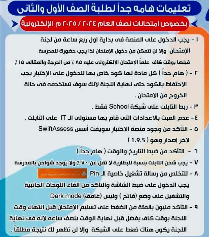 - تعقد امتحانات النقل للصفين الأول والثاني الإعدادي وكذلك امتحانات النقل للمرحلة الابتدائية للصفوف من الثالث الابتدائي إلى الصف السادس الابتدائي في الفترة من ١١/ ١ إلى ١٦/١/٢٠٢٥.