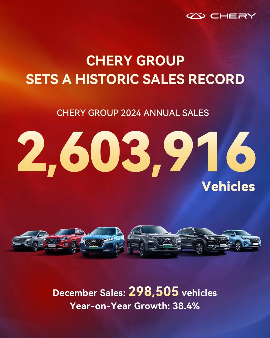 سجلت شركة شيري رقمًا قياسيًا عالميًا جديدًا في عام 2024، حيث بلغت مبيعاتها الشهرية في ديسمبر 298,505 سيارة، بزيادة ملحوظة قدرها 38.4% مقارنة بالشهر نفسه من 2023. وارتفع إجمالي مبيعاتها السنوية إلى 2,603,916 سيارة، محققةً نموًا بنسبة 38.4% عن عام 2023، ومتفوقةً على متوسط معدلات نمو قطاع السيارات بفارق كبير.